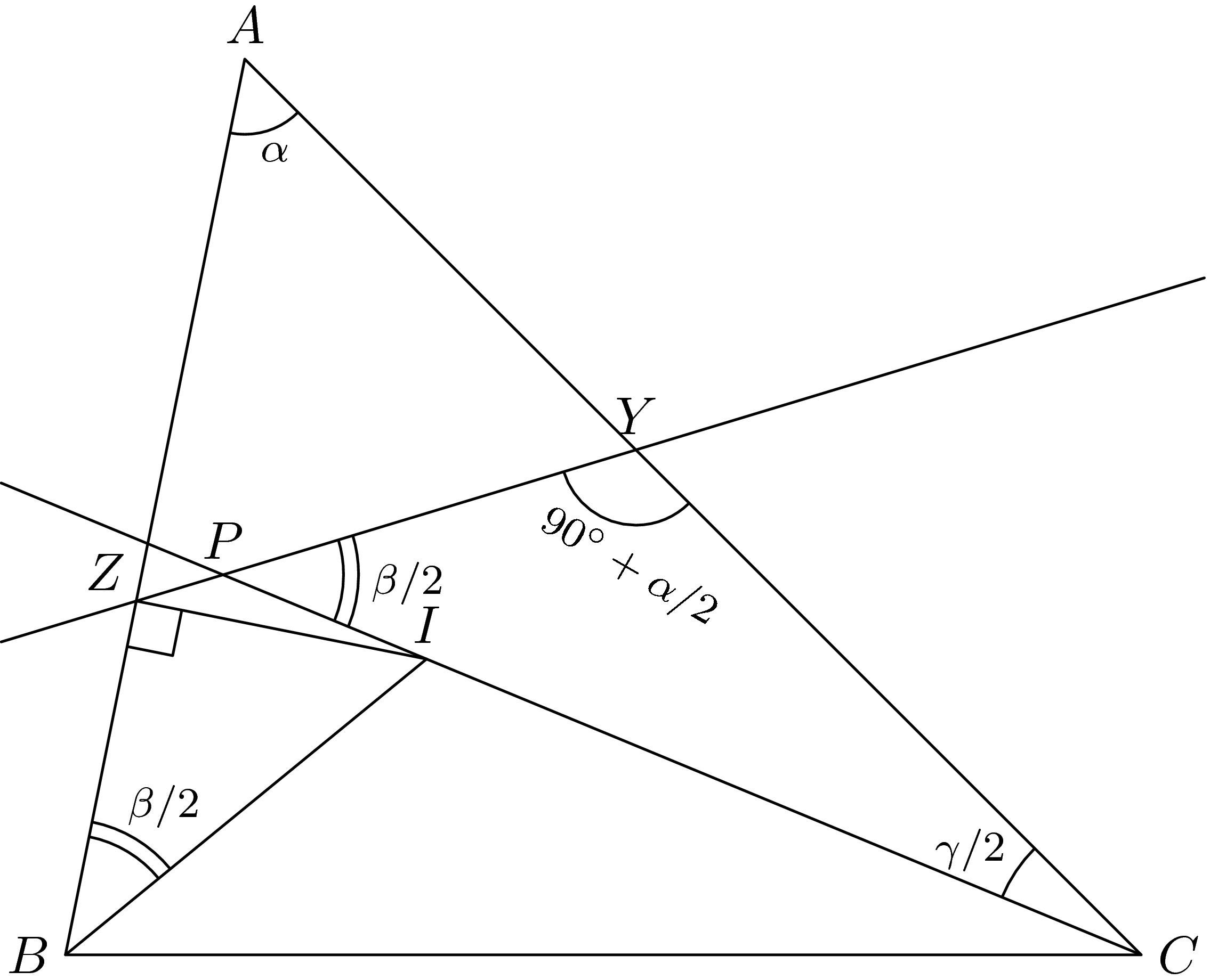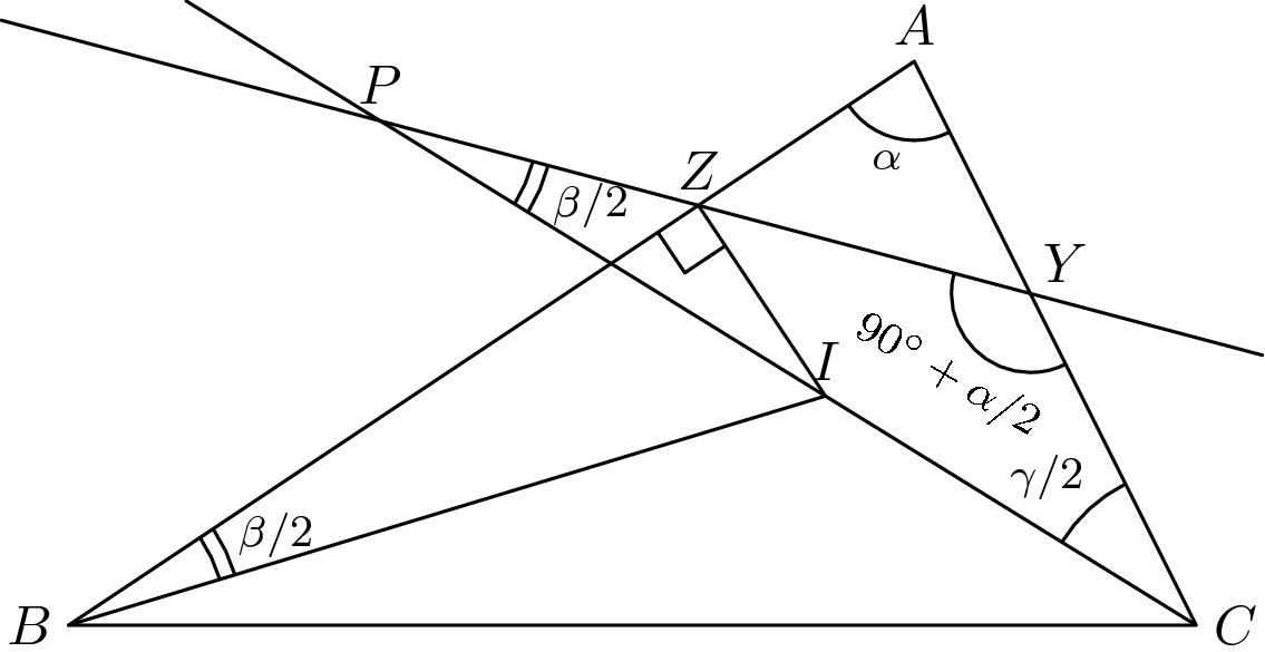 Budeme používať štandardné označenie veľkostí vnútorných uhlov trojuholníka $ABC$. Trojuholník $AYZ$ je rovnoramenný, lebo úsečky $AY$ a $AZ$ sú dotyčnice k jednej kružnice z toho istého bodu. Preto uhol $AYZ$ má veľkosť $90^\circ - \alpha/2$ a jeho susedný uhol $ZYC$ má veľkosť $90^\circ + \alpha /2$. Keďže $CI$ je os uhla $BCA$, vieme, že $|\angle PCY| = \gamma / 2$.