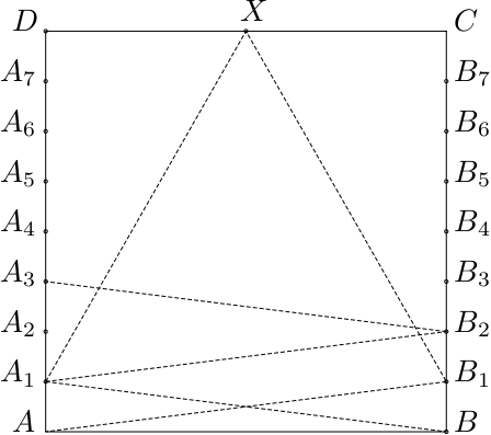 Túto vzdialenosť budeme používať aj ďalej, na stranách $$AD$$ a $$BC$$ si vyznačíme body $$A_1,\, A_2,\, A_3,\, \dots,\, A_7$$ a $$B_1,\, B_2,\, B_3,\, \dots,\, B_7$$, tak, že sa nachádzajú v osminách oboch strán (teda $$AA_1 =\frac 1 8$$, $$AA_2 = \frac 2 8,\, \dots,\, AA_7 = \frac 7 8$$). Len pre kontrolu, dĺžka úsečiek $$AB_1$$ a $$BA_1$$ bude $$|AB_1| = |BA_1| = \sqrt{1^2+{\frac 1 8}^2} = \frac 1 8 \sqrt{65} \approx 1,0077822185,$$