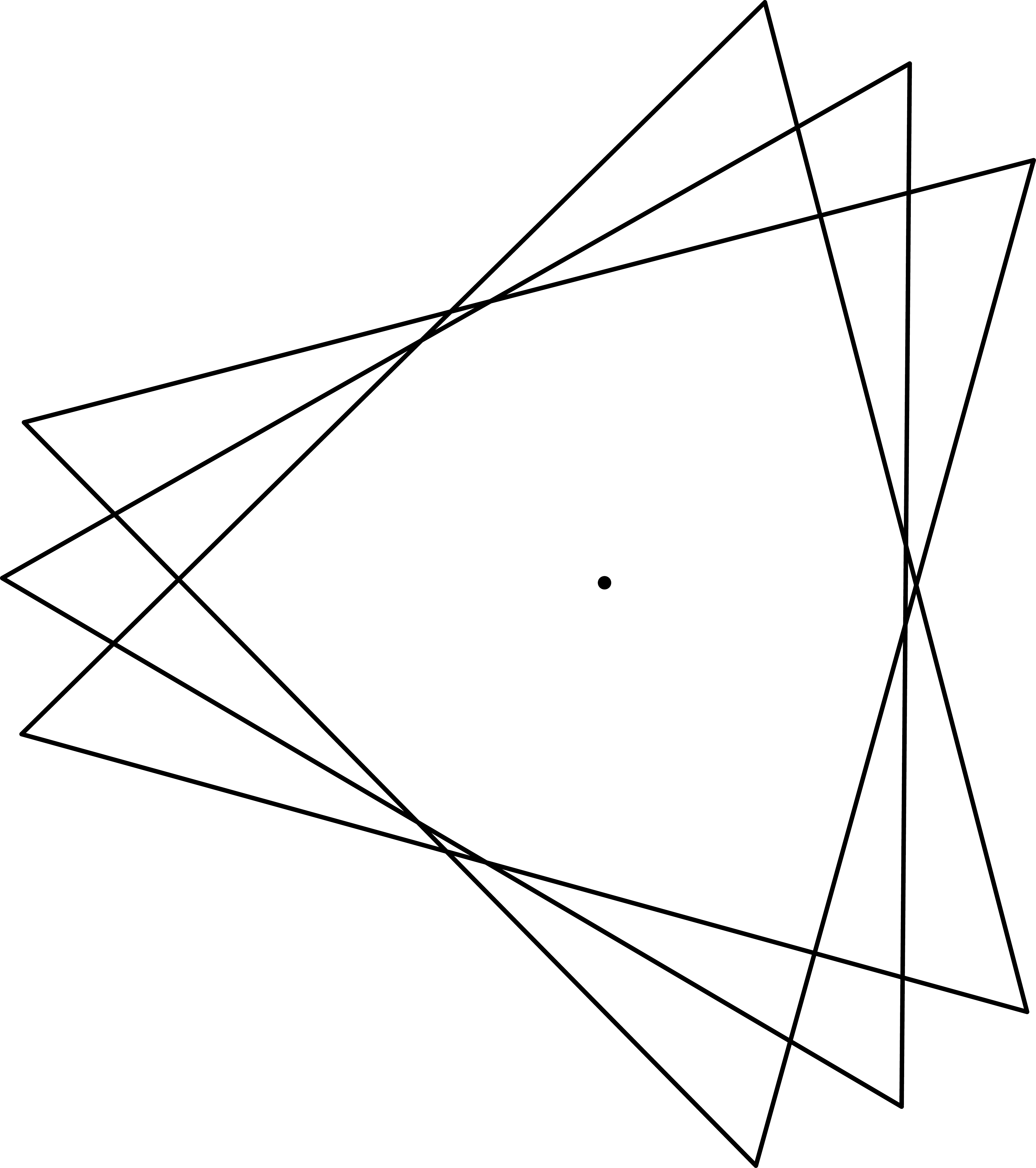 Vezmeme si rovnostranný trojuholník a ten $n$-krát otočíme okolo svojho ťažiska tak, aby trojuholníky spolu nesplynuli.