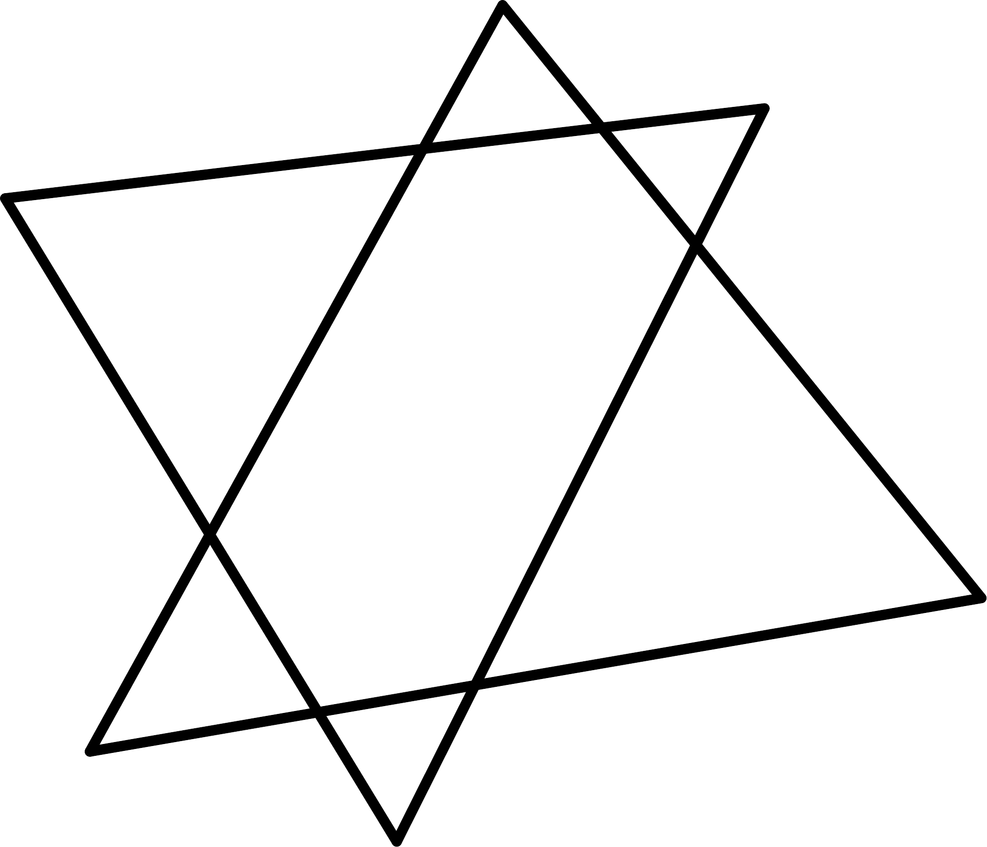 Získali sme nejaký spodný odhad na počet oblastí. To je na začiatok fajn, ale zrejme to nie je najlepšie umiestnenie. Je teda úplne na mieste položiť si otázku, čo by sa muselo stať, aby sme získali viac oblastí. Veľa možností, čo robiť, nemáme, skúsme umiestniť trojuholníky tak, aby sa pretínali. To nám pridá pár ďalších oblastí. Pozrime sa najprv na malé prípady, čo sa udeje, keď budu trojuholníky len dva. Po chvíľke skúšania dôjdeme k tomu, že vieme dostať najviac $8$ oblastí. Napríklad takto:
