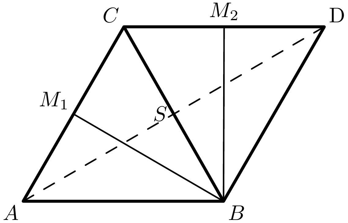 Zo zadania úlohy vieme, že uhly $ACB$ a $M_1BA$ majú rovnakú veľkosť. My potrebujeme zistiť súčet uhlov $M_1BM_2$ a $ACB$. Keďže uhly $M_1BA$ a $M_1BM_2$ majú spoločné rameno $BM_1$, tiež vieme, že výsledkom hľadaného súčtu bude veľkosť uhla $ABM_2$. Označíme si stred úsečky $BC$ ako $S$. Bod $D$ je obrazom bodu $A$ v stredovej súmernosti podľa bodu $S$. Stredová súmernosť zachováva vzdialenosti, takže úsečky $AS$ a $SD$ sú rovnako dlhé. Inak povedané, bod $S$ je stredom úsečky $AD$. Bod $S$ je aj stredom úsečky $BC$, z čoho vieme, že aj úsečky $BS$ a $SC$ majú rovnakú dĺžku.