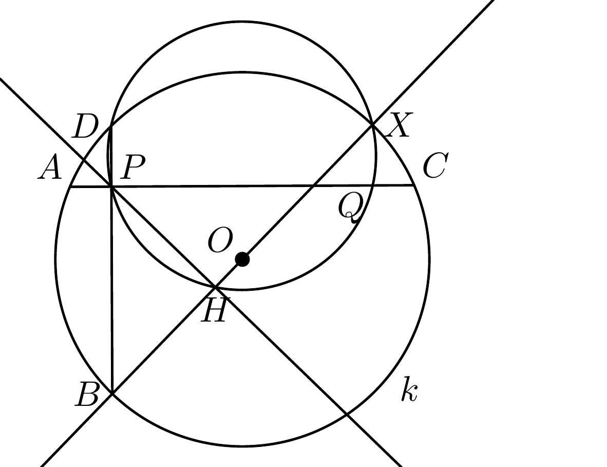 Keďže $X$ leží na priamke $BO$, tak $BX$ je priemer kružnice $k$. Preto $\sphericalangle BDX$ je pravý. Potom ale aj $\sphericalangle PDX$ je pravý. Takže aj bod $D$ leží na Tálesovej kružnici s priemerom $PX$. Preto body $D,\ B,\ H,\ X$ ležia na jednej kružnici s priemerom $PX$. Podľa zadania aj $Q$ leží na tejto kružnici.