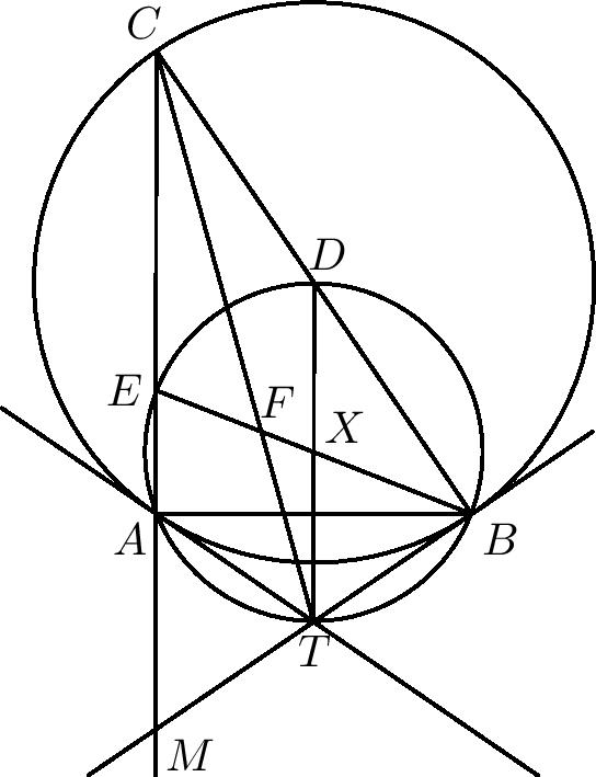 Označme prienik priamok $AC$ a $BT$ ako $M$. O uhle $CBM$ vieme, že má veľkosť $90\si{\degree}$ (pretože je to aj uhol $DBT$ a $BT$ je dotyčnica kolmá na $DB$). Štvoruholník $DBTE$ je tetivový, a tak aj $|\sphericalangle DET|=90\si{\degree}$. Úsečky $DE$ a $BT$ sú kolmé na $BD$ a sú rovnobežkami. Nakoľko je bod $D$ stred strany $BC$ a úsečka $DE$ je rovnobežná s $BT$, respektíve s $BM$, tak úsečka $DE$ je stredná priečka v trojuholníku $MBC$ a bod $E$ je stred strany $MC$.