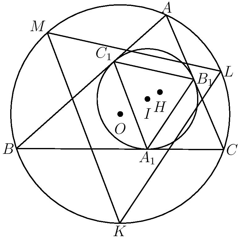 Majme trojuholník $ABC$. Označme $A_1$, $B_1$, $C_1$ postupne body dotyku jeho vpísanej kružnice so stranami $BC$, $AC$, $AB$. Nech $O$ a $I$ sú postupne stredy kružnice opísanej a vpísanej trojuholníku $ABC$ a $H_1$ je ortocentrum trojuholníka $A_1B_1C_1$. Dokážte, že body $O$, $I$, $H_1$ ležia na jednej priamke.