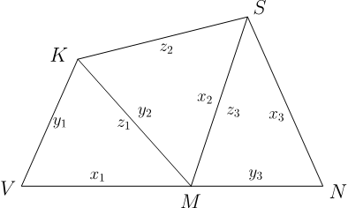 Napríklad $x_1/x_3=z_1/z_3$. Vyjadríme $x_1$ ako $x_1=x_3z_1/z_3$. Stačí sa pozrieť o odsek vyššie vidíme, že $x_1=y_3$. Tieto dve strany tvoria stranu $VN$, a keďže sú rovnaké, bod $M$ bude ležať v strede strany $VN$. Hotovo.