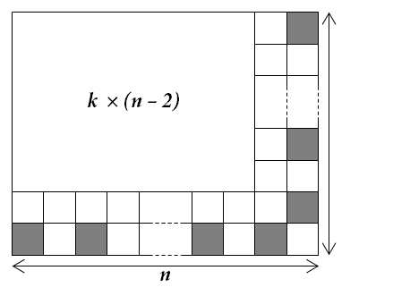V posledom riadku jedálne zafarbíme políčko v každom nepárnom stĺpci a v poslednom stĺpci zafarbíme políčko v každom nepárnom riadku (pozri obrázok). Takto sme zafarbili $(k + 2)/2 + n/2$ políčok. Iba jedna lampa osvetlí dve zafarbené políčka, a to lampa na spoločnom rohu políčok $(k + 2, n - 1)$ a $(k+1,n)$. Okrem nej každá lampa osvetlí najviac jedno zafarbené políčko. Preto na osvetlenie zafarbených políčok potrebujeme aspoň $2((k + 2)/2 + n/2) - 1 = k + n + 1$ lámp.