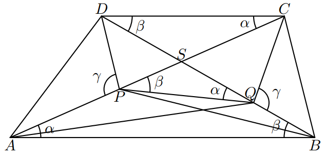 Kika si kúpila poncho v tvare lichobežníka. Na lichobežníku $ABCD$ so základňami $AB$ a $CD$ ležia na uhlopriečkach $AC$ a $BD$ po rade body $P$, $Q$ tak, že platí $|\sphericalangle APD|$ = $|\sphericalangle BQC|$. Ukažte, že platí $|\sphericalangle AQD|$ = $|\sphericalangle BPC|$.