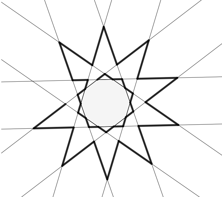 Ako by sme mohli rozumne umiestniť priamky? Aby sme sa v tom dobre vyznali a aby obrázok vyzeral prehľadne, asi by bolo dobré, keby je to rozmiestnenie čo najviac symetrické. Tiež potrebujeme mať veľa priesečníkov. Taký pekný symetrický útvar je pravidelný $10$-uholník. Keď jeho strany predĺžime, dostaneme $10$ priamok. Potom už nie je ťažké nakresliť štrkáča dĺžky $38$, napríklad tak ako na obrázku dole.