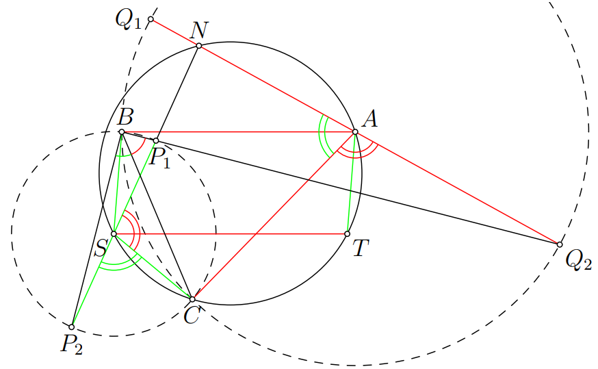 V zadaní máme veľa rovnakých dĺžok. Dobre sa s nimi pracuje, keď sú pokope. Zvoľme teda bod $B$ tak, aby $STAB$ bol rovnobežník. Ďalej, obraz bodu $T$ v osovej súmernosti podľa osi strany $SA$ označme $C$. Zjavne bod $C$ leží na kružnici opísanej tetivovému štvoruholníku $STAN$. Dostali sme tak pekne pri sebe rovnaké dĺžky $|SP_1| = |SP_2| = |SB| = |SC|$ a $|AQ_1| = |AQ_2| = |AB| = |AC|$. Inými slovami, body $P_1$, $P_2$, $B$, $C$ ležia na kružnici $k$ so stredom v $S$ a body $Q_1$, $Q_2$, $B$, $C$ na kružnici $l$ so stredom v $A$. Tieto kružnice sú tálesovými nad priemermi $P_1P_2$ a $Q_1Q_2$.