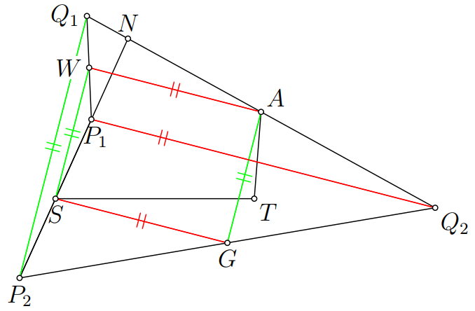 Môžeme si všimnúť, že v úlohe vystupuje dosť stredov: $S$, $W$, $A$, $G$ sú postupne stredy úsečiek $P_2P_1$, $P_1Q_1$, $Q_1Q_2$, $Q_2P_2$. Preto nám prídu vhod stredné priečky. V trojuholníku $P_1P_2Q_1$ máme strednú priečku $SW$, a preto je rovnobežná s úsečkou $P_2Q_1$. Podobne, z trojuholníka $Q_2P_2Q_1$ dostaneme, že stredná priečka $AG$ je rovnobežná so stranou $P_2Q_1$. Máme teda tri rovnobežky: $SW$, $AG$ a $P_2Q_1$. Podobným spôsobom dostaneme tiež rovnobežky $WA$, $GS$, $P_1Q_2$. Z toho vyplýva, že $SWAG$ je rovnobežník. Aby sme ukázali, že to je obdĺžnik, stačí nám ukázať, že priamky $P_2Q_1$ a $P_1Q_2$ sú na seba kolmé.