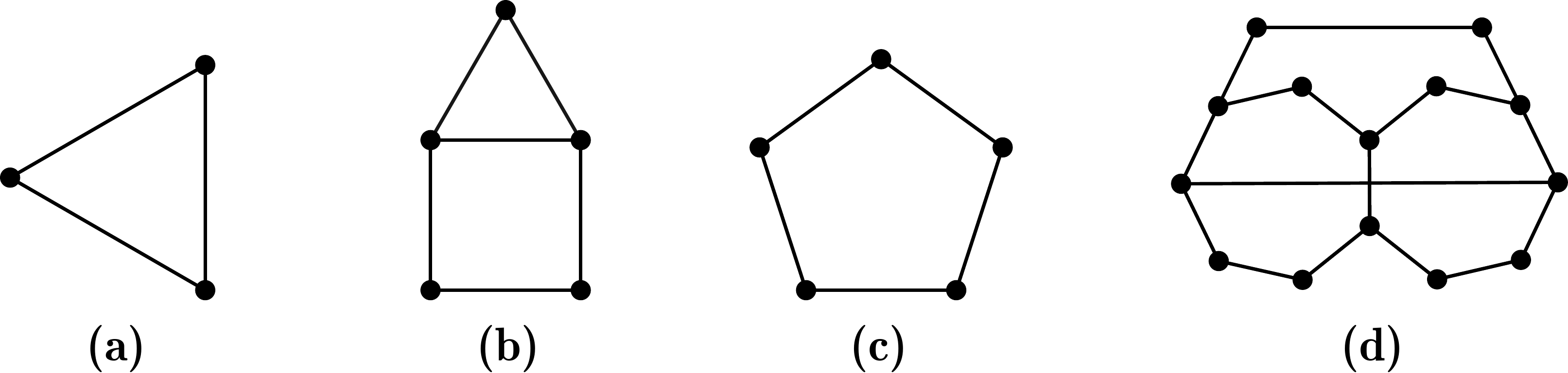 Pri nachádzaní toho, ako sa pasažieri môžu poznať, narazíme na problém s nerozdeliteľnosťou. Nie je to totiž vlastnosť, ktorá by bola vidno z obrázku. Aby sme skontrovali, či naši pasažieri sú skutočne nerozdeliteľní, tak jedna možnosť je vyskúšať všetky možné rozdelenia na dve skupiny a overiť, že v každom rozdelení sa niekto v rámci jednej skupiny pozná. Môže nás ale napadnúť aj iných spôsob, ako nerozdeliteľnosť zaručiť. Napríklad, ak máme trojicu pasažierov, v rámci ktorej sa pozná každý s každým. Také trojice sa nachádzajú na obrázkoch (a) a (b). Taktiež to môžeme dosiahnuť tým, že medzi pasažiermi sa bude nachádzať skupina nepárneho počtu pasažierov, ktorej členovia sa poznajú do kolečka. Obrázok (c) je tvorený práve takouto $5$-člennou skupinou. Na obrázku (d) sa nachádzajú viaceré $7$-členné a aj $11$-členné „kolečko“.