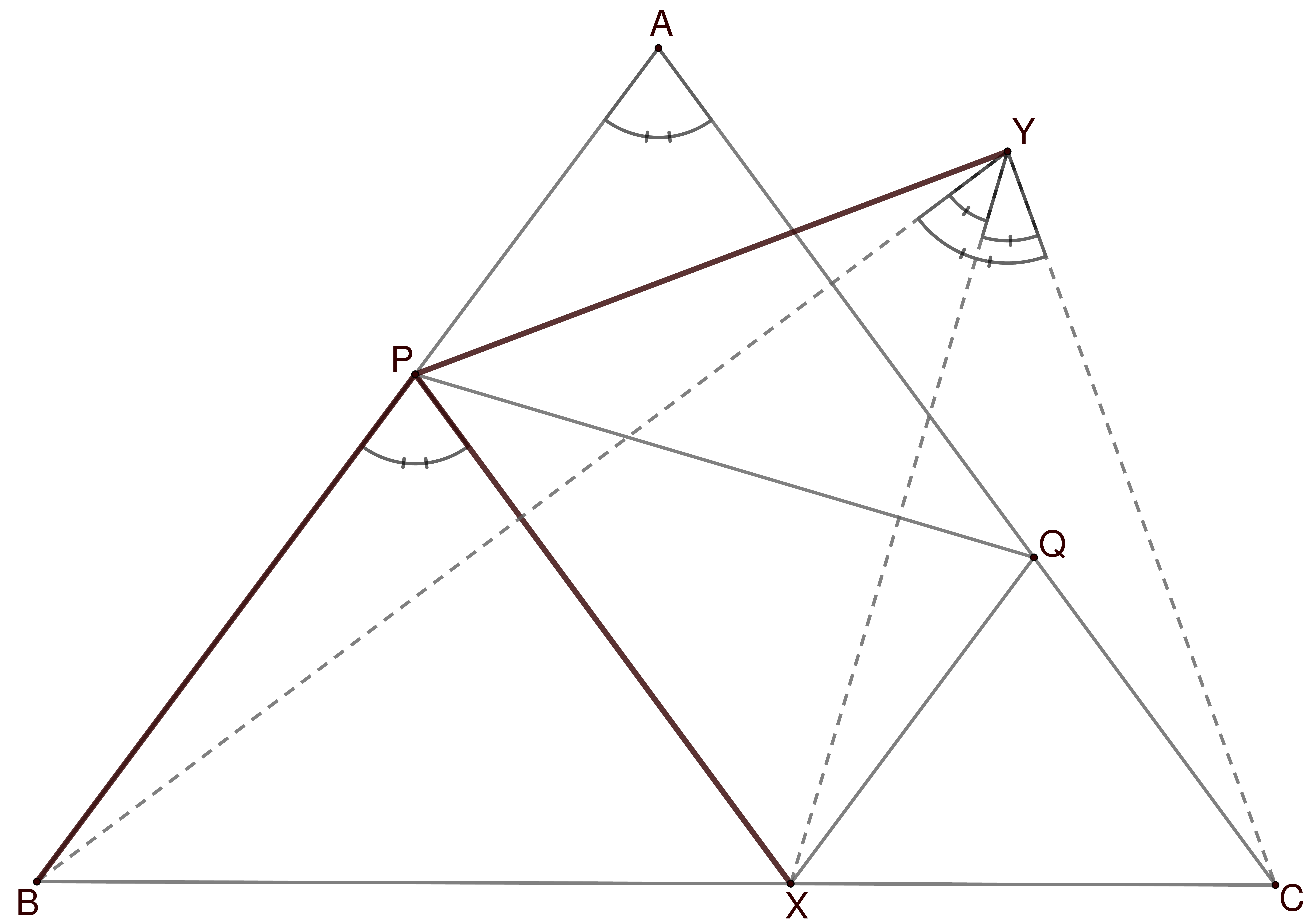 Hlavné myšlienky tohto riešenia sú zobrazené na nasledujúcom obrázku. Zvýraznené úsečky majú rovnakú dĺžku a dvojprúžkový uhol je dvakrát väčší ako jednoprúžkový. Kružnice opísané trojuholníkom ABC a BXY som zámerne nenakreslil aby bol obrázok viac prehľadný. Lepšie je si ich len predstaviť.