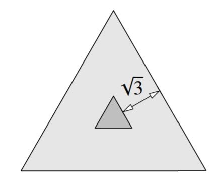 Jožo na letisku narazil na zaujímavý amulet ako na obrázku. Pozostával z dvoch rovnostranných trojuholníkov. Predavačka mu prezradila, že vzdialenosť každého bodu obvodu malého trojuholníčka k najbližšiemu bodu obvodu veľkého trojuholníka je $\sqrt{3}$. Určte rozdiel medzi dĺžkami strán malého a veľkého trojuholníka.