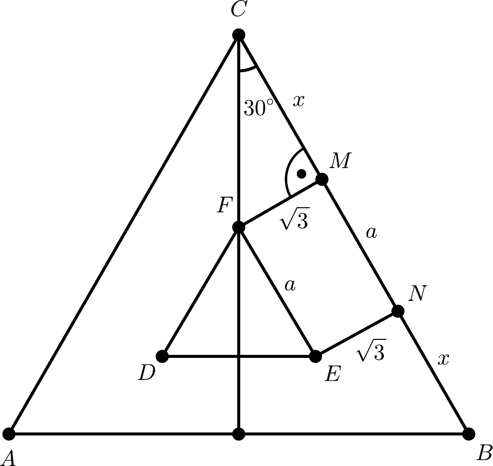 Teraz si treba uvedomiť, čo chceme vypočítať. Chceme rozdiel dĺžky strany veľkého trojuholníka od dĺžky strany malého trojuholníka. Vidíme, že obe strany obsahujú dĺžku strany $a$, takže po odčítaní sa tieto dĺžky vyrušia a ostane nám len dvakrát dĺžka $x$. A to teraz potrebujeme vypočítať. Ak spravíme výšku na stranu $AB$ z bodu $C$ nášho veľkého trojuholníka, rozdelí sa nám uhol pri vrchole $C$ na polovicu, a teda na dva $30^\circ$ uhly. Platí to vďaka tomu, že trojuholník je rovnostranný. Táto výška prechádza rovnako aj cez vrchol $F$ (vďaka spoločnému ťažisku trojuholníkov). Vznikol nám pravouhlý trojuholník $FMC$, s pravým uhlom pri vrchole $M$ (keďže z vrcholu $F$ sme viedli kolmicu) a s $30^\circ$ uhlom pri vrchole $C$. Rovnako tento postup vieme aplikovať aj na ostatné vrcholy trojuholníka vďaka symetrii. Ukážeme si teraz dva možné postupy výpočtu, prvý čo využíva goniometrické funkcie a druhý s použitím Pytagorovej vety.