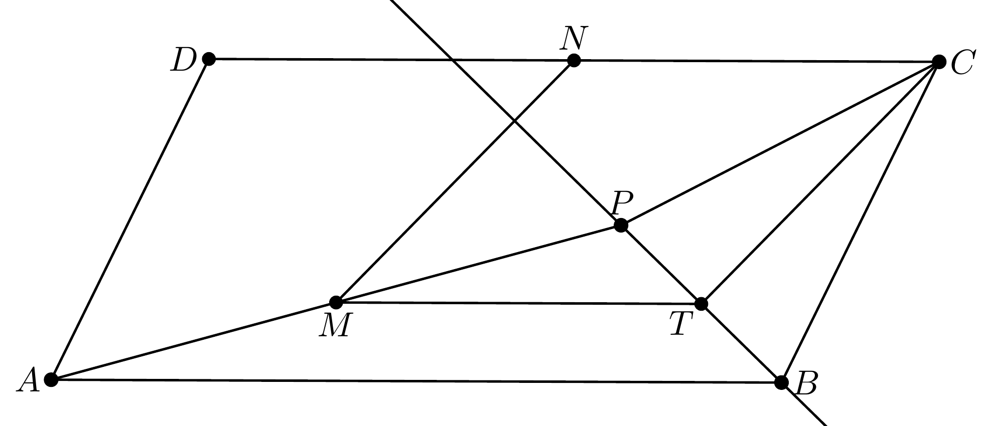 Vnútri rovnobežníka $ABCD$ leží bod $P$ tak, že $|PC| = |BC|$. Stredy úsečiek $AP$ a $CD$ označme postupne $M$, $N$. Ukážte, že priamky $BP$ a $MN$ sú na seba kolmé.