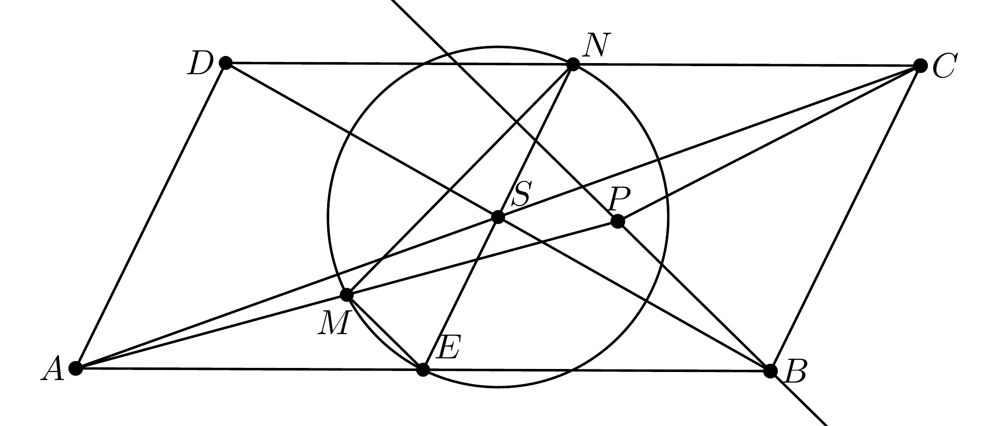 Keďže bod $M$ je stredom úsečky $AP$, dostávame prvú indíciu, kde rovnoľahlosť hľadať. Pozn. síce bod $N$ je stredom $DC$, ale rovnoľahlosť z bodu $D$ alebo $C$ by nám nepomohla uchopiť body $M$ a $P$, kdežto rovnoľahlosť v bode $A$ alebo $P$ sa nemusí zapodievať bodom $N$ lebo je stredom úsečky $CD$ a s tým sa nám dobre počíta. Skúsenejšie oko si všimne, že rovnoľahlosť z bodu $A$ a koeficientom $\frac{1}{2}$ je výhodnejšia ako rovnoľahlosť z bodu $P$. Totiž bod $P$ zobrazí do bodu $M$, bod $C$ zobrazí do bodu $S$, čo je priesečník uhlopriečok, bod $B$ zobrazí do bodu $E$, stredu úsečky $AB$, a zvyšné body nás nemusia trápiť, rozmyslite si prečo.