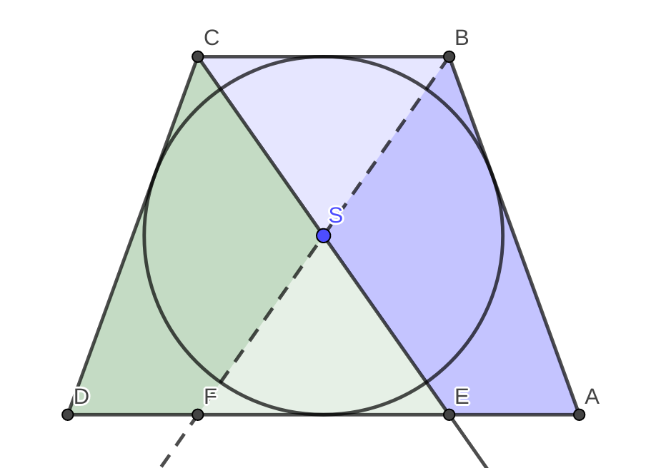 Lichobežník, ktorý máme zo zadania, je rovnostranný. Preto uhly, pri vrcholoch $A$ a $B$ sú rovnaké ako uhly pri vrcholoch $D$ a $C$. Lichobežník je teda osovo symetrický. Preto aj os uhla $ABC$ ho delí rovnako ako os $BCD$. Keď máme nakreslené obe tieto osi a vieme že lichobežník je osovo symetrický, je ľahké všimnúť si, že štvoruholníky $EABS$ (tmavomodrá) a $DFSC$ (tmavozelená) majú rovnaký obsah. Keď sa teraz pozrieme na naše pôvodné oblasti, ktorých rovnosť chceme dokázať, a odmyslíme si tieto dva štvoruholníky, ostáva nám ukázať rovnosť obsahov trojuholníkov $FES$ (bledomodrá) a $SBC$ (bledozelená).