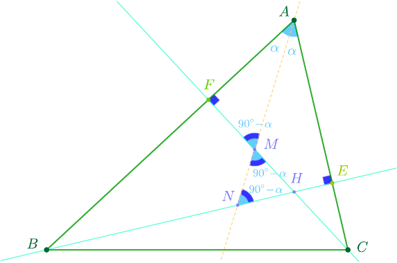 Všimnite si, že to, či tieto dva uhly sú skutočne vrcholové, závisí od toho, aký obrázok si nakreslíme. Na osi uhla $BAC$ môžu ležať body $M$ a $N$ v opačnom poradí, a vtedy budú uhly $AMF$ a $NMH$ ten istý uhol. Avšak keďže situácia je symetrická, tým sa len vymení úloha bodov $M$ a $N$ a $MNH$ bude tak či tak rovnoramenný. ↩