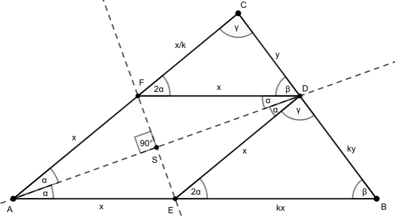 Vďaka tomu, že $AD$ je os uhla $BAC$ a $EF$ je kolmica na túto os, vieme povedať, že $|AE|=|AF|=x$. Vyplýva to tiež zo zhodností trojuholníkov $ASE$ a $ASF$, kde $S$ je stred strany $AD$. Tieto trojuholníky zdieľajú stranu $AS$ a majú rovnaké uhly pri vrcholoch $A$ a $S$. Tiež si môžeme všimnúť zhodnosť trojuholníkov $ASF$ a $DSF$. Keďže $S$ je stred strany, $|AS|=|SD|$, zdieľajú stranu $SF$ a oba majú medzi týmito stranami pravý uhol. Analogicky vieme postupovať aj pri trojuholníku $DSE$. Vďaka týmto zhodnostiam vieme povedať, že $|AE|=|ED|=|DF|=|AF|=x$. A tiež uhly $|SAF|=|EAS|=|FDS|=|SDE|=\alpha$.