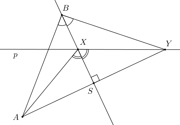 Teraz zostrojme os uhla $ABY$. Táto os nám kolmo pretne základňu $AY$ v jej strede, označme $S$, a pretne sa aj s priamkou $p$, označme $X$. Môžeme si skontrolovať, že to naozaj je ten náš hľadaný bod $X$. Keď spojíme $A$ s $X$, dostávame dva trojuholníky, $AXS$ a $XYS$, ktoré majú spoločnú jednu stranu $XS$, rovnaký (pravý) uhol pri vrchole $S$ a veľkosť úsečiek $AS$ a $SY$ je rovnaká, teda tieto trojuholníky sú zhodné. Nakoniec trojuholník $AXY$ je rovnoramenný a priamka $BX$ je osou strany $AY$, a teda aj osou uhla $AXY$.