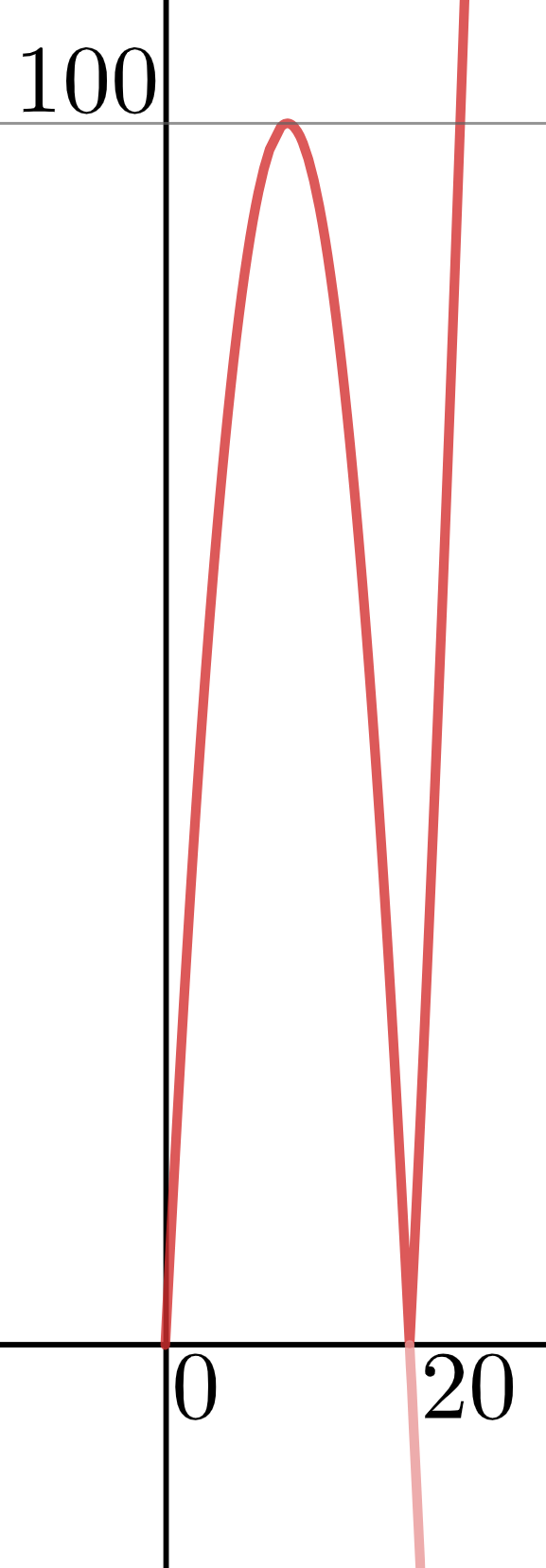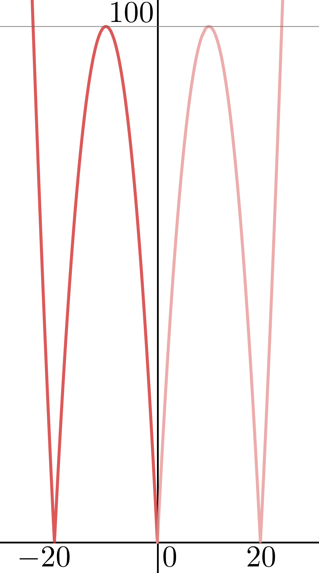 Tak naša parabola má priesečníky s $ x $-ovou osou v bodoch $ x = 20 $ a $ x = 0 $. Tiež si teraz vieme vypočítať, kde je a akú má hodnotu vo vrchole – parabola je symetrická aspoň na intervale $)$ to platí aj pre našu. Potom teda je jej vrchol v strede medzi priesečníkmi a nadobúdame v ňom hodnotu $(|10\cdot(20-10)| = 100$. Super, tak máme dobrú predstavu, ako vyzerá naša parabola na kladnom definičnom obore. Celá je ešte v absolútnej hodnote, tak záporné funkčné hodnoty zobrazme do kladnej polroviny podľa osi $ x $. Tým dostávame červenú krivku na obrázku vyššie (všimnite si, ako sa záporné hodnoty paraboly znázornené svetlou červenou preklopili cez $ x $-ovú os do kladných). Nakoniec záporné čísla dokončíme vďaka parite našej funkcie a dostávame nasledujúci obrázok: