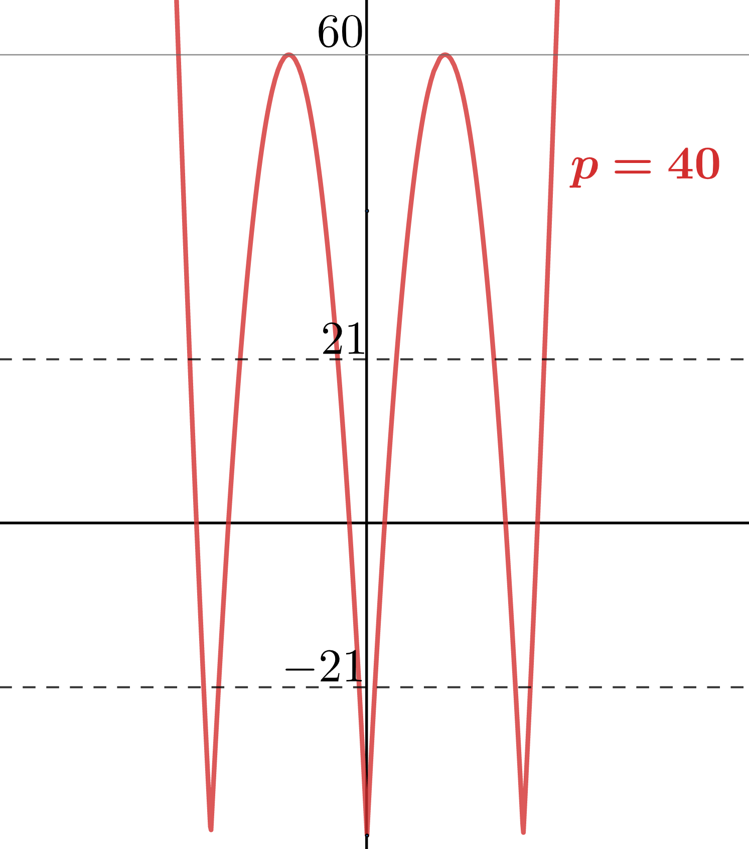Uvedomme, si že na zistenie počtu priesečníkov s hodnotou $ 21 $ nám stačí zistiť počet priesečníkov funkcie bez absolútnej hodnoty s hodnotami $ 21 $ a $ -21 $. Jednoducho každý priesečník s $ -21 $ sa nám zobrazí na priesečník, ktorý nás zaujíma ($ 21 $). Potom však parameter naozaj nerobí nič iné ako to, že funkciu posúva nižšie a vyššie. Naša funkcia bez vonkajšej absolútnej hodnoty nadobúda každú hodnotu maximálne $ 6 $-krát, a teda jedna šestica bude musieť pretnúť $ 21 $ a druhá $ -21 $. Takže potrebujeme, aby $$100 - p > 21,$$ lebo potrebujeme, aby bol vrchol paraboly nad hodnotou $ 21 $ a zároveň $$0 - p < -21,$$ aby najmenšia hodnota na parabole pretla $ -21 $.