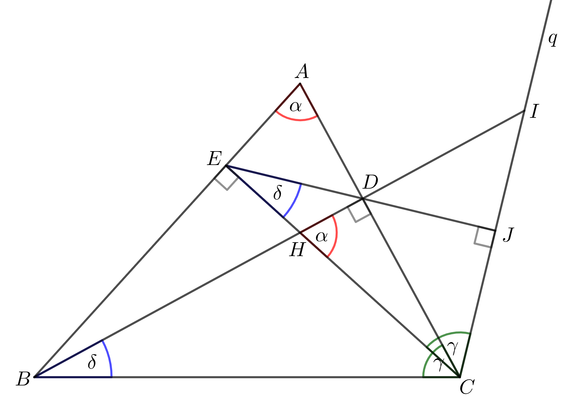 V ostrouhlom trojuholníku $ABC$ označme $D,\, E$ postupne päty výšok z vrcholov $B,\, C$ a priesečník týchto výšok označme $H$. Nech $q$ je kolmica z vrcholu $C$ na priamku $DE$ a $I$ je priesečník $q$ s priamkou $BD$. Dokážte, že trojuholníky $HIC$ a $ABC$ sú podobné.