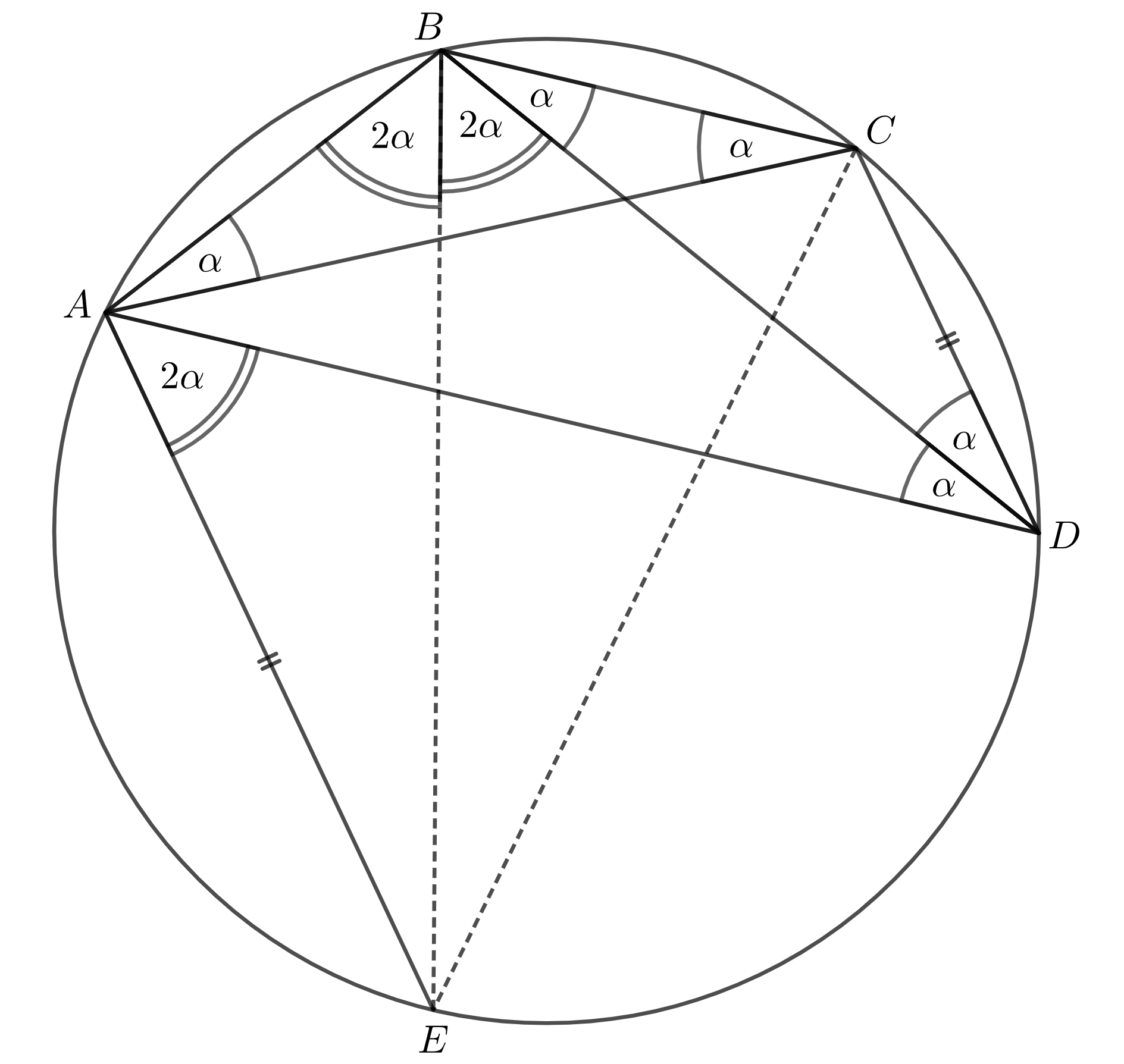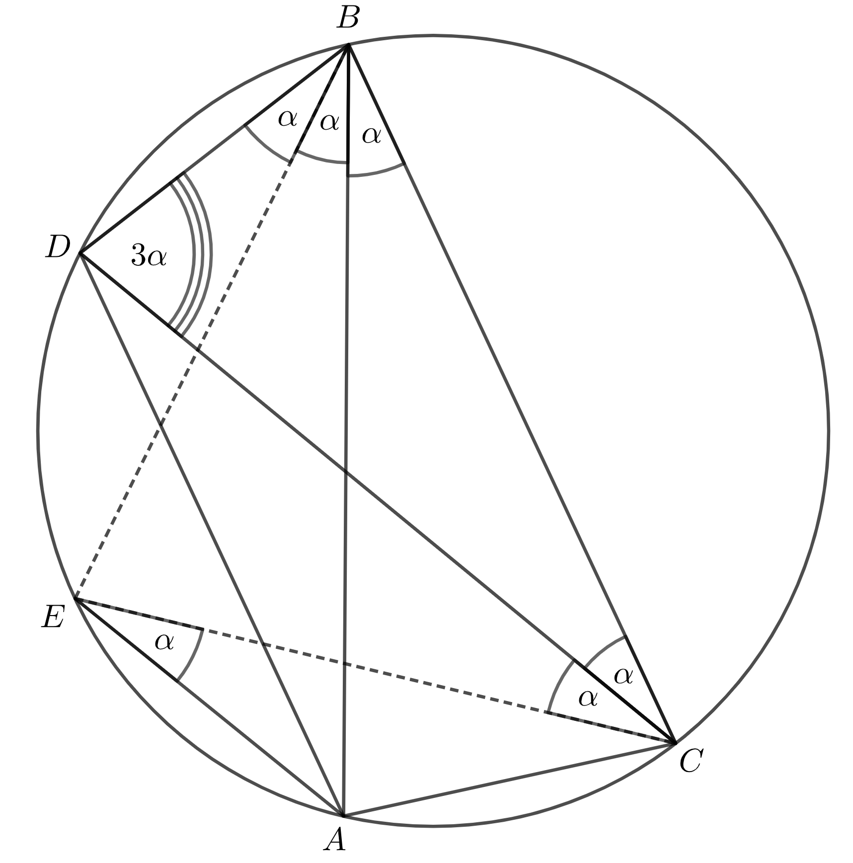 Teraz druhá konfigurácia. Tentokrát si v trojuholníkoch $ABC$ a $BCD$ pomenujeme $\alpha$ uhol oproti základni, teda $\sphericalangle BCD$ a $\sphericalangle ABC$, ktorého hodnotu máme nájsť. Z obvodových uhlov vieme, že $\sphericalangle ABC= \sphericalangle AEC\ (=\alpha)$. Následne opäť využijeme striedavé uhly: $\sphericalangle AEC=\sphericalangle ECD\ (=\alpha)$ a nakoniec zase raz obvodové uhly $\sphericalangle ECD = \sphericalangle DBE\ (=\alpha)$. Vďaka osi uhla $BE$ vieme, že $\sphericalangle DBE = \sphericalangle EBA\ (=\alpha)$. Keďže trojuholník $DBC$ je rovnoramenný, uhly pri jeho základni sú rovnaké, teda $\sphericalangle DBC=\sphericalangle BDC = 3 \alpha$.