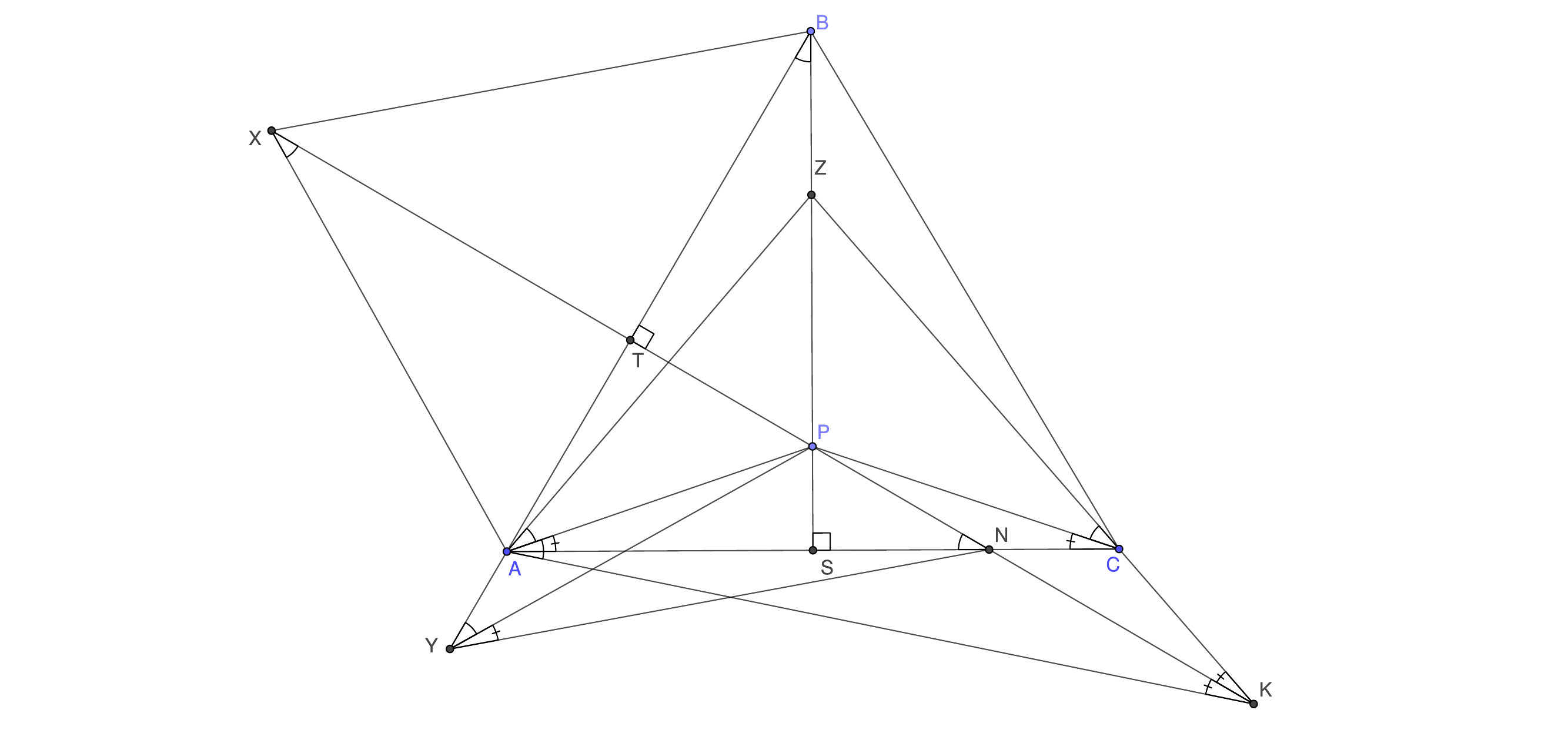 Toto je však už hračka. Vieme, že $|\sphericalangle ABP|=\delta$, a teda nám stačí ukázať to isté pre uhol $PAK$. Keďže body $APCK$ ležia na kružnici, vieme: $|\sphericalangle PAK|=180^\circ-|\sphericalangle PCK|=|\sphericalangle ZCP|=|\sphericalangle ZAP|=|\sphericalangle PNA|=|\sphericalangle ABP|=\delta.$ A tým sme úlohu dokázali.
