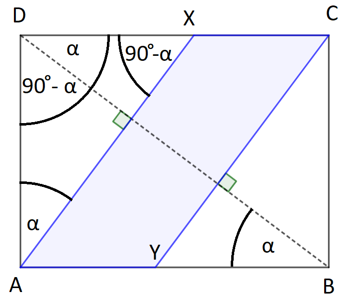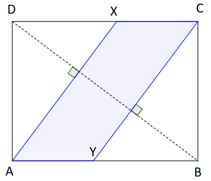 Keďže úsečky $AX$ a $YC$ sú obe kolmé na uhlopriečku $BD$, tak musia byť navzájom rovnobežné, taktiež vieme, že úsečky $AY$ a $XC$ sú navzájom rovnobežné, a teda celý štvoruholník $AXCY$ musí byť rovnobežník. Teraz si na obrázku môžeme rýchlo všimnúť, že na základe vety $uu$ sú trojuholníky $\triangle ABD \sim \triangle DAX$ podobné.