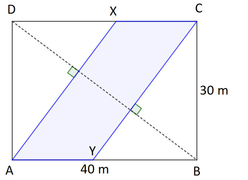 Brehy riek sa tiahli rovno od protiľahlých vrcholov kolmo na uhlopriečku výbehu spájajúcu ostatné dva vrcholy až ku protiľahlým stranám, ako na obrázku 1 (obrázok je len ilustračný). Akú časť Pedrovho výbehu zaberala rieka, ak boli rozmery výbehu $30\text{ m} \times 40\text{ m}$?