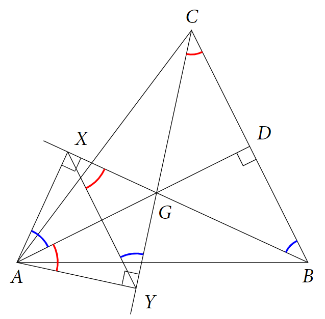 Ďalšie dôležité pozorovanie vieme spraviť pri štvoruholníku $AYGX$. Protiľahlé uhly pri vrcholoch $Y$ a $X$ sú oba pravé a dávajú dokopy $180^\circ$, čím robia zo štvoruholníka $AYGX$ tetivový štvoruholník. Tým pádom vieme povedať, že uhly $\sphericalangle GAX$ a $\sphericalangle XYG$ sú zhodné, nakoľko sú to obvodové uhly.