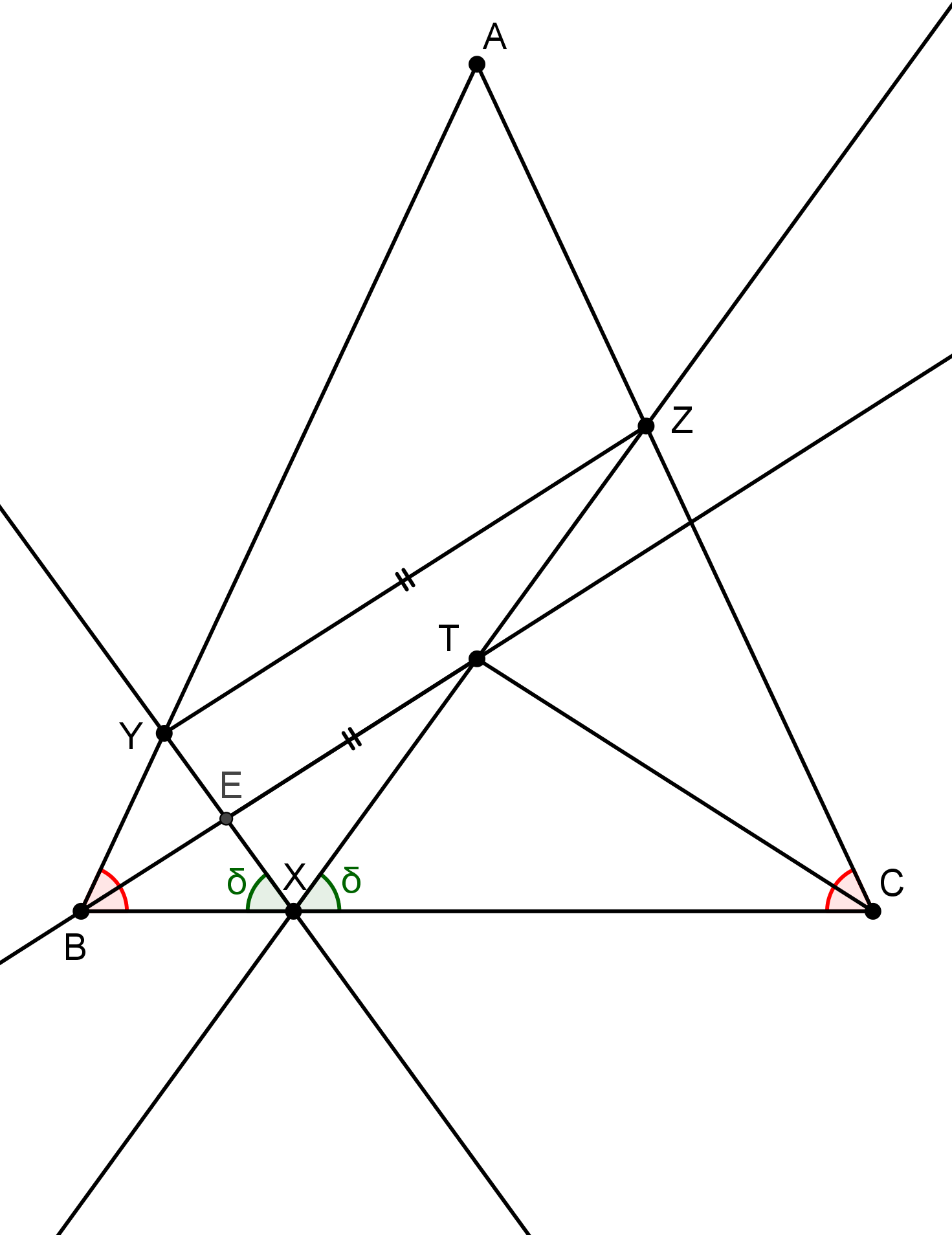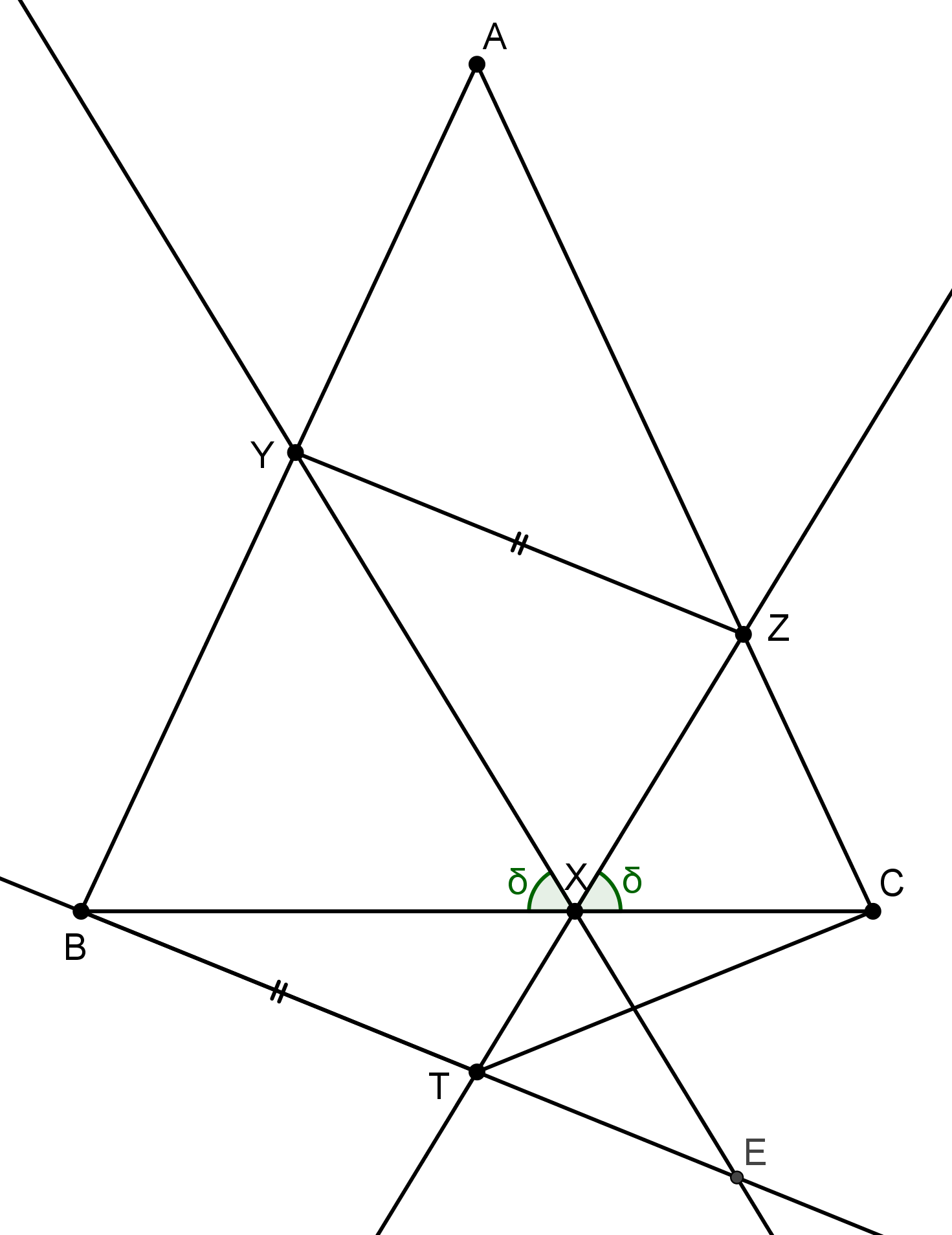 To sme však už dopočítali, keď sme prvýkrát hovorili o daných trojuholníkoch. Zistili sme, že tieto uhly sú oba $180^\circ - \delta$. Môžeme si teda všimnúť, že trojuholníky $BXE$ a $CXT$ sú podobné. Potom nutne $|\sphericalangle XBT| = |\sphericalangle XCT|$, takže $T$ leží na osi $BC$, čo je skutočne os uhla $\sphericalangle BAC$.