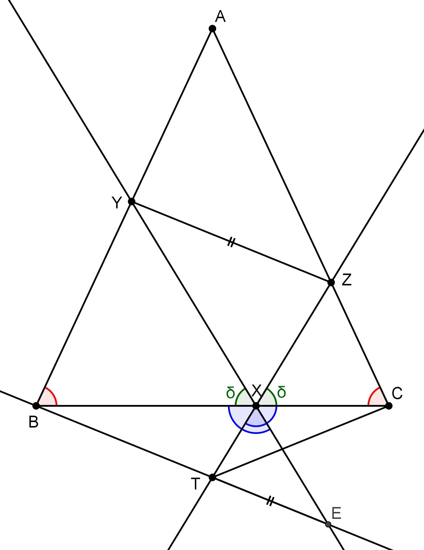 V takomto prípade je $X$ priamo na osi súmernosti trojuholníka $ABC$. Vďaka $|\sphericalangle BXY| = |\sphericalangle CXZ|$ je osovo súmerný aj trojuholník $XYZ$ a teda $YZ$ je kolmá na $AX$. Rovnobežka s $YZ$ je teda totožná s $BC$, jej priesečník s $XZ$ bude priamo $X$. Stred $X = T$ strany $BC$ leží na osi uhla $ABC$, keďže je to rovnoramenný trojuholník.