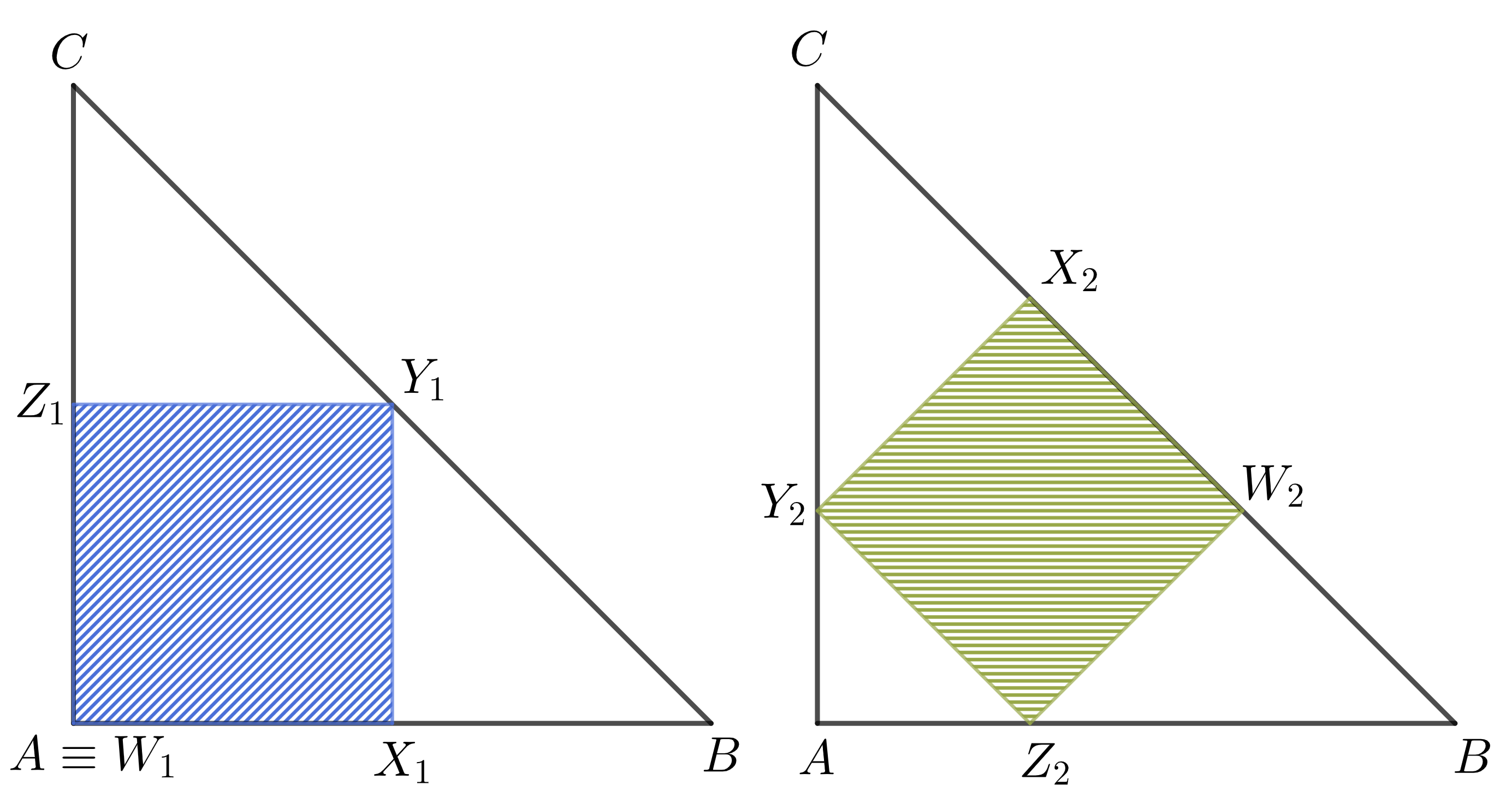Teraz sa povenujme zelenej váze. Keďže $\sphericalangle ABC$ a $\sphericalangle W_2BZ_2$ je ten istý uhol a $|\sphericalangle BAC|=|\sphericalangle BW_2Z_2|=90^\circ$, tak trojuholníky $\triangle ABC$ a $\triangle W_2BZ_2$ sú podobné. To ale znamená aj, že trojuholník $\triangle W_2BZ_2$ je rovnoramenný, čiže $|BW_2|=|W_2Z_2|$. Rovnakým postupom na opačnom konci trojuholníka $ABC$ sa vieme presvedčiť, že $|CX_2|=|X_2Y_2|$. Z toho, že váza je štvorec, ďalej vieme $|W_2Z_2|=|W_2X_2|=|X_2Y_2|$. Teraz však môžeme použiť naše rovnoramenné trojuholníky, z čoho dostaneme, že $|BW_2|=|W_2X_2|=|CX_2|$, čiže $W_2,X_2$ nám úsečku $BC$ rozdeľujú na tretiny. Aká je však jej dĺžka? Úsečka $BC$ je preponou v pravouhlom rovnoramennom trojuholníku $ABC$ s dĺžkou odvesny $a$. Môžeme teda použiť Pytagorovu vetu, z ktorej dostaneme $$|BC|^2=|AB|^2+|AC|^2=a^2+a^2=2a^2\implies|BC|=\sqrt{2a^2}=\sqrt2a.$$ Nuž a keďže $W_2X_2$ tvorí tretinu úsečky $BC$, tak strana zeleného štvorca je $z=\frac{\sqrt2}{3}a$.