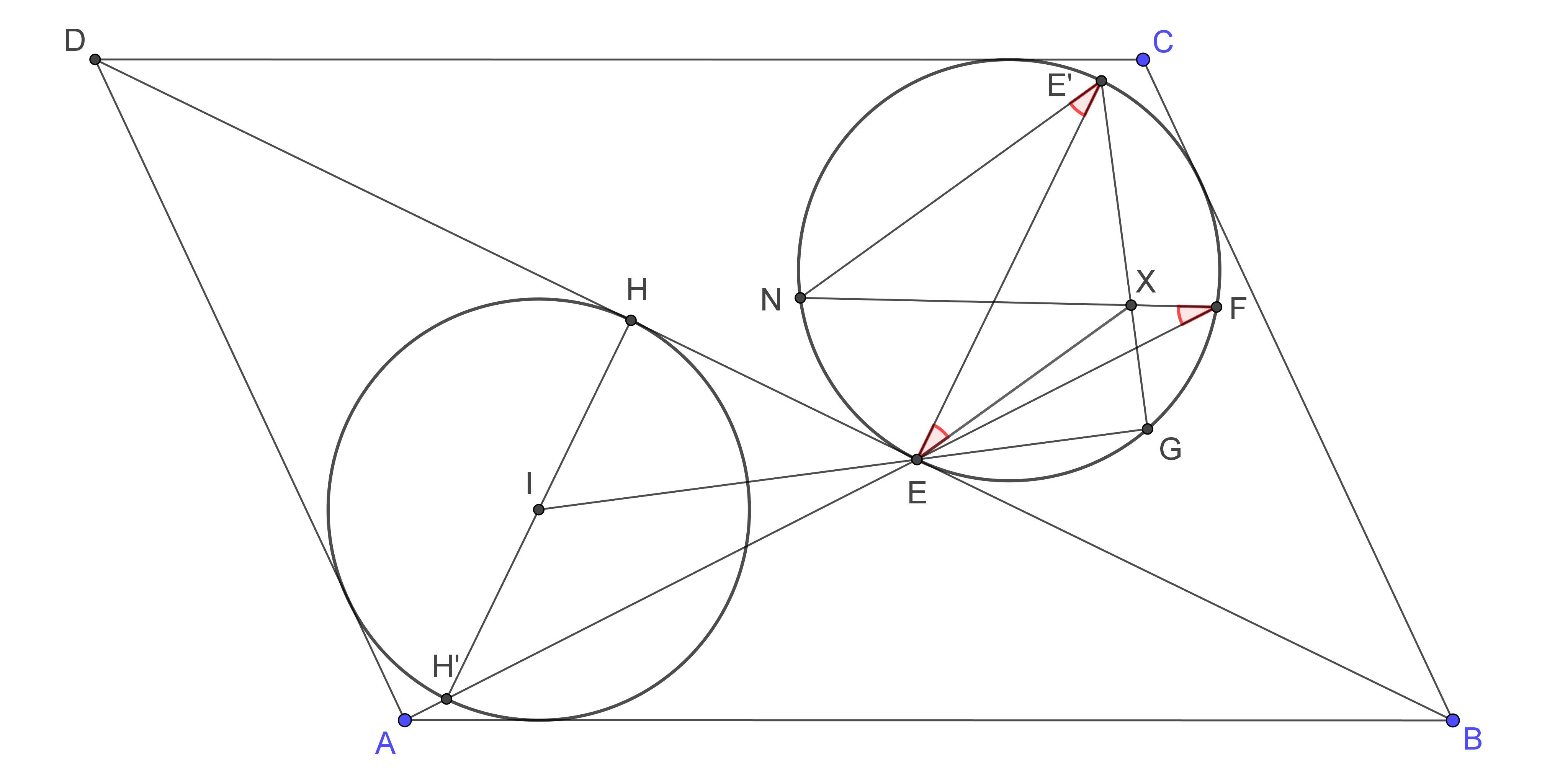 z čoho vyplýva, že $FGEE’$ je harmonický štvoruholník a platí $\frac{|FG|}{|FE’|} =\frac{|EG| }{|EE’|}$. Z tejto rovnosti vyplýva, že os uhla $GEE’$ delí stranu $GE’$ v rovnakom pomere ako os uhla $GFE’$, z čoho vyplýva, že $X$ leží na osi uhla $GFE’$. Označme antiŠvrčkov bod trojuholníka $EGE’$ k bodu $E$ ako $N$. Keďže $FX$ je os uhla $GFE’$, $N$ bude ako Švrčkov bod trojuholníka $E’FG$ na $FX$ ležať. Zároveň bude $N$ ležať aj na osi vonkajšieho uhla $GEE’$, teda platí $EN \perp EX$, pričom $EE’$ je priemer kružnice, preto $EN \perp NE’$, z čoho vyplýva $NE’ \parallel EX$. Teraz už jednoduchým uhlením dokážeme, že sa kružnica opísaná trojuholníku $EXF$ dotýka priamky $EE’$ v bode $E$. Totiž, $$|\angle EFX| = |\angle EFN| = |\angle EE’N| = |\angle E’EX|,$$ z čoho vyplýva, že uhol $E’EX$ je úsekový k uhlu $EFX$, čím je dôkaz hotový.