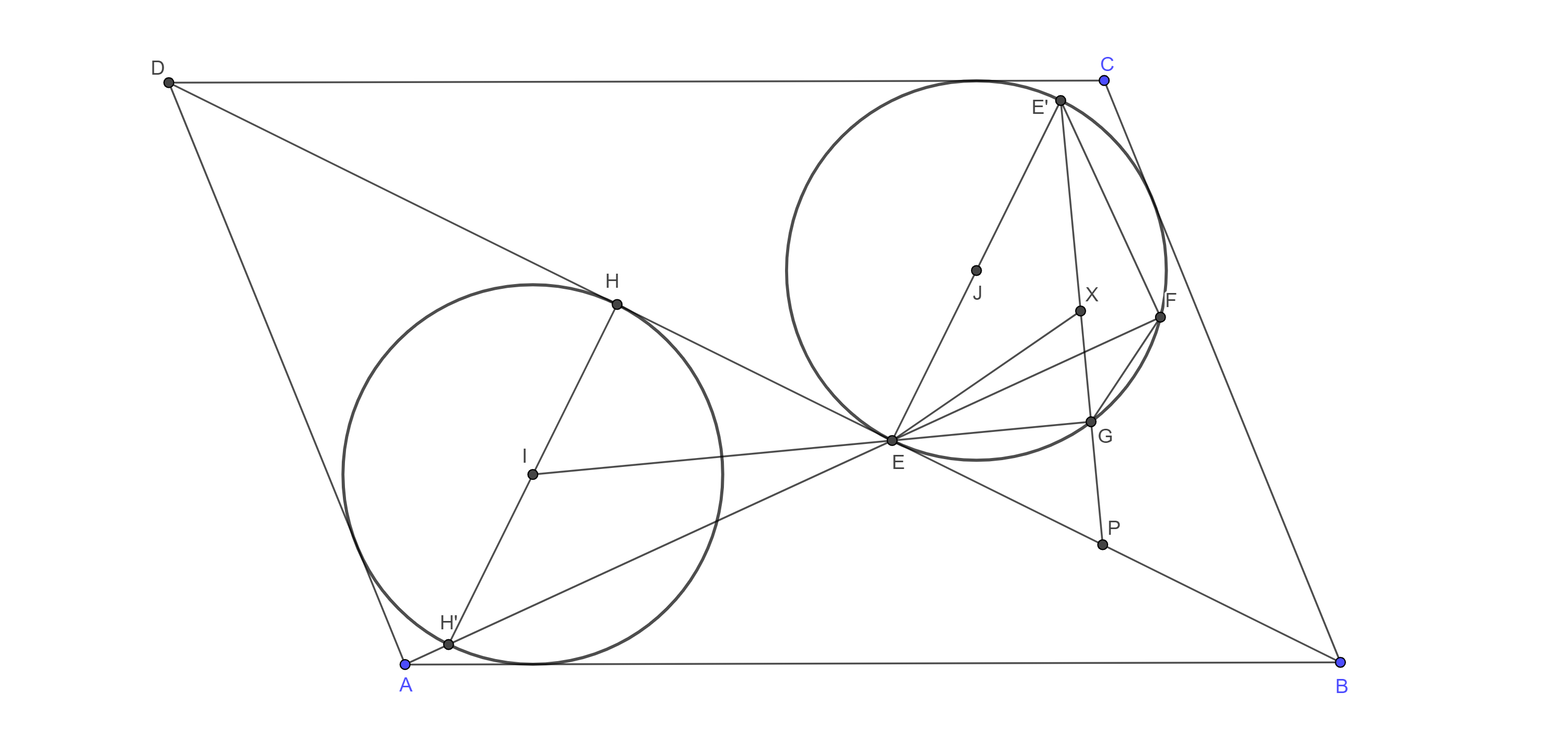 Je daný rovnobežník $\check A\check B\check C\check D$. Označme $\check I$ stred kružnice vpísanej trojuholníku $\check A\check B\check D$ a $\check \omega$ kružnicu vpísanú trojuholníku $\check B\check C\check D$, ktorá sa dotýka strany $\check B\check D$ v bode $\check E$. Priamky $\check A\check E$ a $\check I\check E$ pretínajú $\check \omega$ postupne v bodoch $\check F$ a $\check G$.
