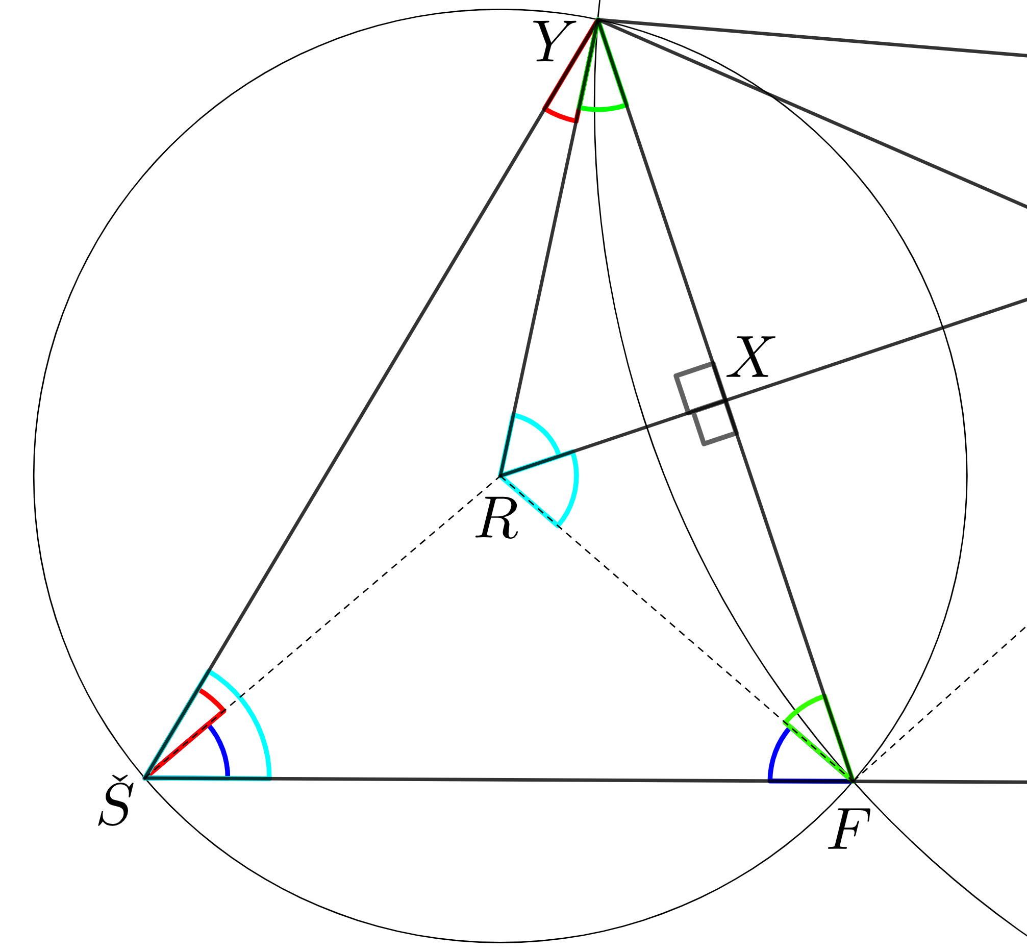 Trojuholníky $Y\check SR$, $\check SFR$, $FYR$ sú všetky rovnoramenné, teda aj ich uhly pri základni budú rovnaké. Z trojuholníka $YRX$ vyplýva $$\begin{align} 90^\circ + \textcolor[RGB]{0, 255, 255}{\sphericalangle} + \textcolor[RGB]{000, 255, 000}{\sphericalangle} &= 180^\circ,\ \textcolor[RGB]{0, 255, 255}{\sphericalangle} + \textcolor[RGB]{000, 255, 000}{\sphericalangle} &= 90^\circ,\ \textcolor[RGB]{0, 255, 255}{\sphericalangle} &= 90^\circ - \textcolor[RGB]{000, 255, 000}{\sphericalangle}.\end{align}$$ Z trojuholníka $\check SFY$ vieme, že $$2\textcolor[RGB]{255, 000, 000}{\sphericalangle} + 2\textcolor[RGB]{000, 000, 255}{\sphericalangle} + 2\textcolor[RGB]{000, 255, 000}{\sphericalangle} = 180^\circ,$$ čo môžeme vykrátiť dvomi a dostaneme $$\begin{align} \textcolor[RGB]{255, 000, 000}{\sphericalangle} + \textcolor[RGB]{000, 000, 255}{\sphericalangle} + \textcolor[RGB]{000, 255, 000}{\sphericalangle} &= 90^\circ,\ \textcolor[RGB]{255, 000, 000}{\sphericalangle} + \textcolor[RGB]{000, 000, 255}{\sphericalangle} &= 90^\circ - \textcolor[RGB]{000, 255, 000}{\sphericalangle}.\end{align}$$ Spojením s predchádzajúcou rovnicou dostaneme $$\begin{align} \textcolor[RGB]{0, 255, 255}{\sphericalangle} &= 90^\circ - \textcolor[RGB]{000, 255, 000}{\sphericalangle} = \textcolor[RGB]{255, 000, 000}{\sphericalangle} + \textcolor[RGB]{000, 000, 255}{\sphericalangle},\ \textcolor[RGB]{0, 255, 255}{\sphericalangle} &= \textcolor[RGB]{255, 000, 000}{\sphericalangle} + \textcolor[RGB]{000, 000, 255}{\sphericalangle}.\end{align}$$ Ukázali sme teda, že platí rovnosť $|\sphericalangle YRS|=|\sphericalangle Y\check SM|$.