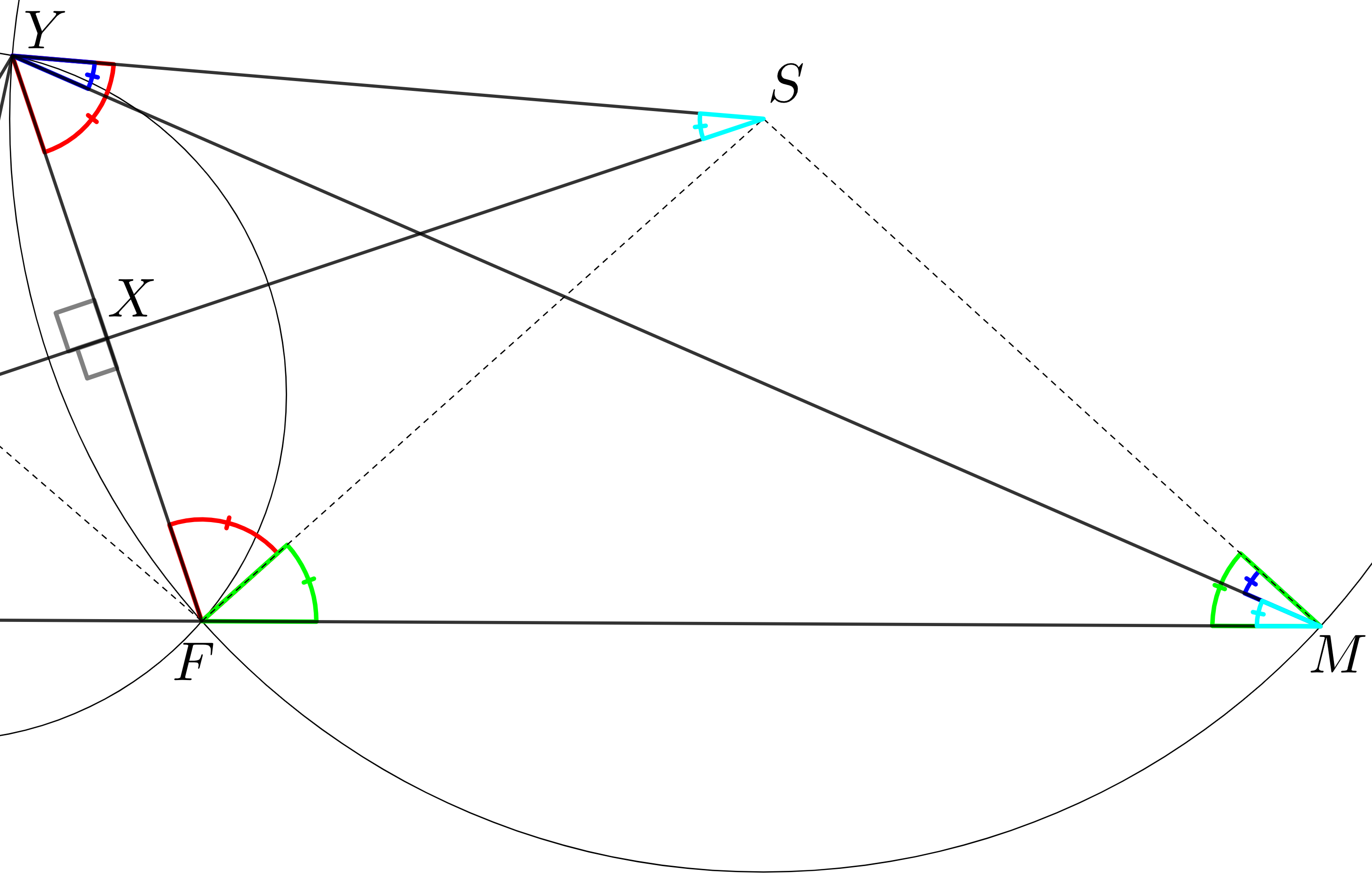 Môžeme si všimnúť, že $\sphericalangle \check SFY$ je obvodový ku stredovému $\sphericalangle \check SRY$, a teda platí rovnosť $|\sphericalangle \check SRY|=2|\sphericalangle \check SFY|$. Rovnako aj $\sphericalangle YFM$ je obvodový ku $360^\circ - \sphericalangle YSM$, a teda platí rovnosť $360^\circ -|\sphericalangle YSM|=2|\sphericalangle YFM|$.