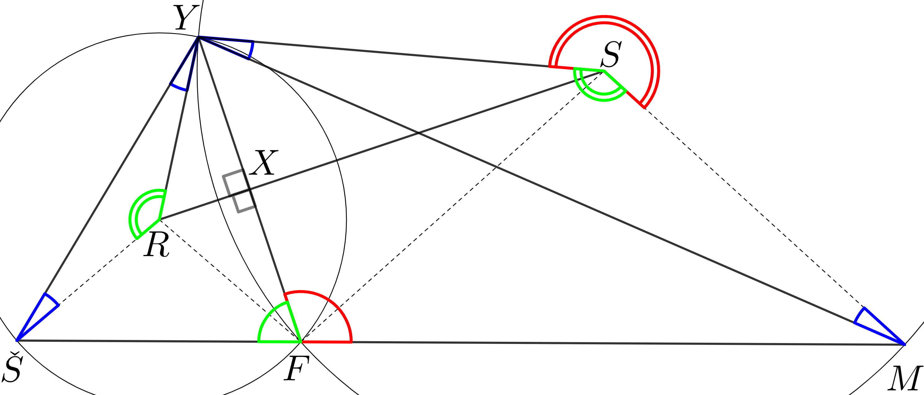 Na začiatok si spojme $Y$ a $F$, ktoré tvoria jedinú spoločnú tetivu oboch kružníc, ktorá je zároveň kolmá na spojnicu stredov kružníc $RS$. To vieme pretože stred opísanej kružnice leží na osiach strán, zároveň oba stredy musia ležať na osi $YF$, teda ich spojnica leží na osi $YF$. Ich priesečník si označíme ako bod $X$. Skúsme sa teraz pozrieť na trojuholník $FY\check S$ a ukázať z neho $|\sphericalangle YRS|=|\sphericalangle Y\check SM|$.