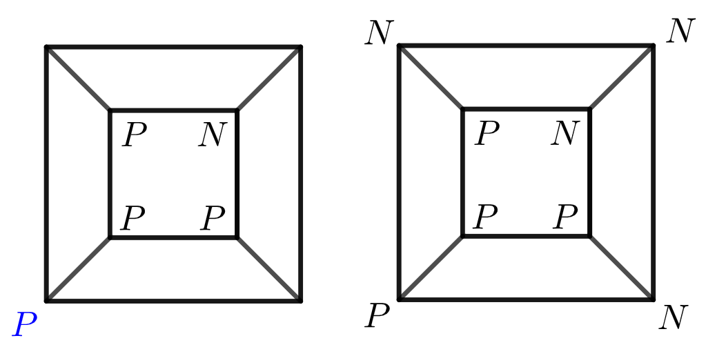 Hľadanie vhodného rozloženia čísel do vrcholov si môžeme zjednodušiť nasledujúcou úvahou: Na každej strane kocky chceme mať nepárne číslo, čo môžeme dosiahnuť buď tak, že sčítame tri párne a jedno nepárne, alebo tri nepárne a jedno párne. Povedzme, že máme stenu, ktorej tri vrcholy majú párne číslo a jeden má nepárne. Tým ale dostaneme ďalšie dve steny s aspoň dvoma párnymi číslami vo vrcholoch, a teda musia mať vo vrcholoch práve tri párne čísla. Tri sme ale už použili a zostalo nám iba jedno, takže musí byť vo vrchole, ktorý majú tieto dve steny spoločný (obrázok vľavo). Zvyšné vrcholy tak majú nepárne čísla. Preto keď si kocku vhodne otočíme, dostaneme situáciu ako na obrázku vpravo. (Rovnaký výsledok by sme dostali aj keby sme začali stenou s troma vrcholmi s nepárnym číslom.) Potom keď si rozložíme napríklad párne čísla, nemalo by byť ťažké doplniť tie nepárne, aby vyšlo čo potrebujeme.