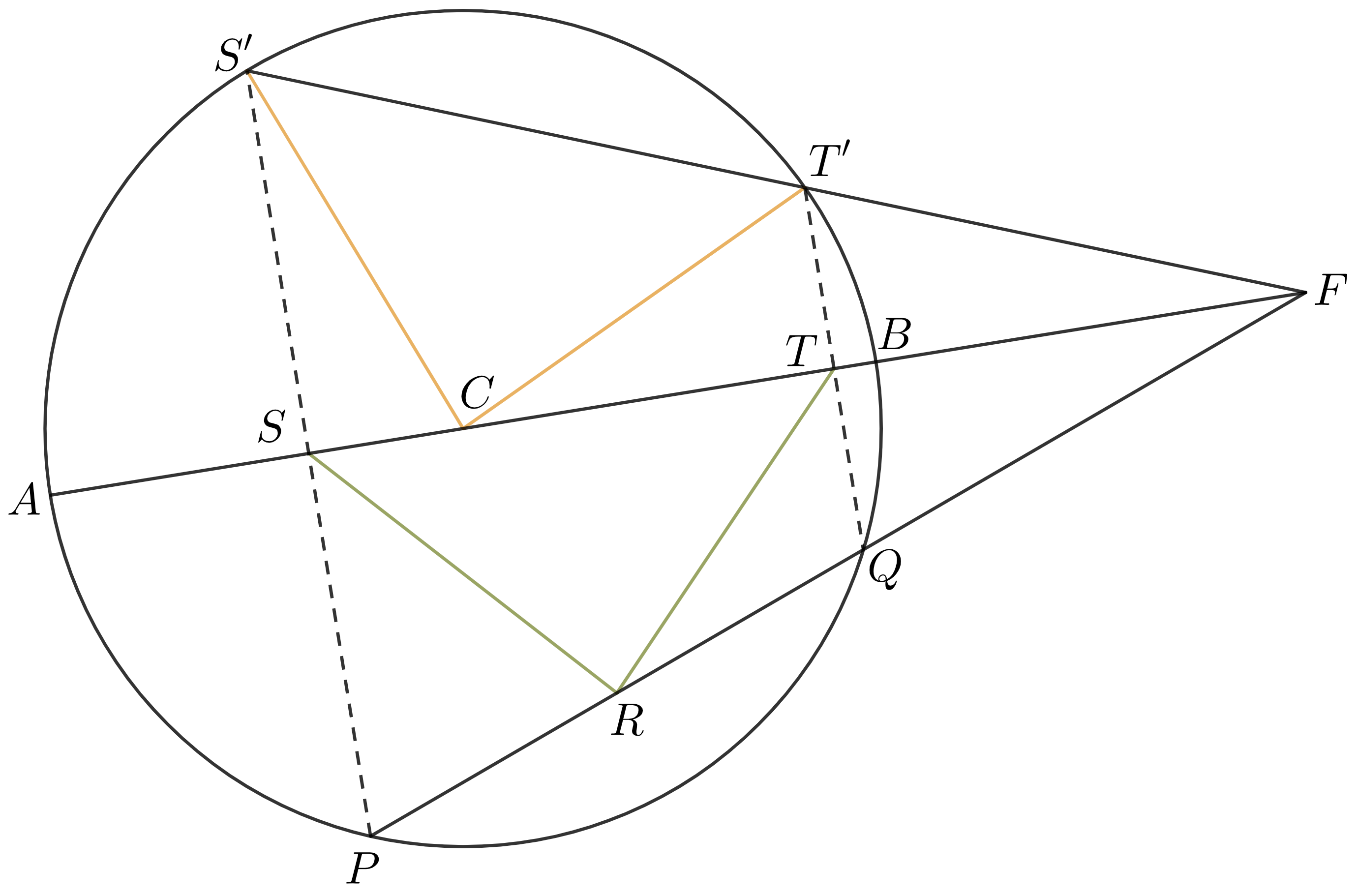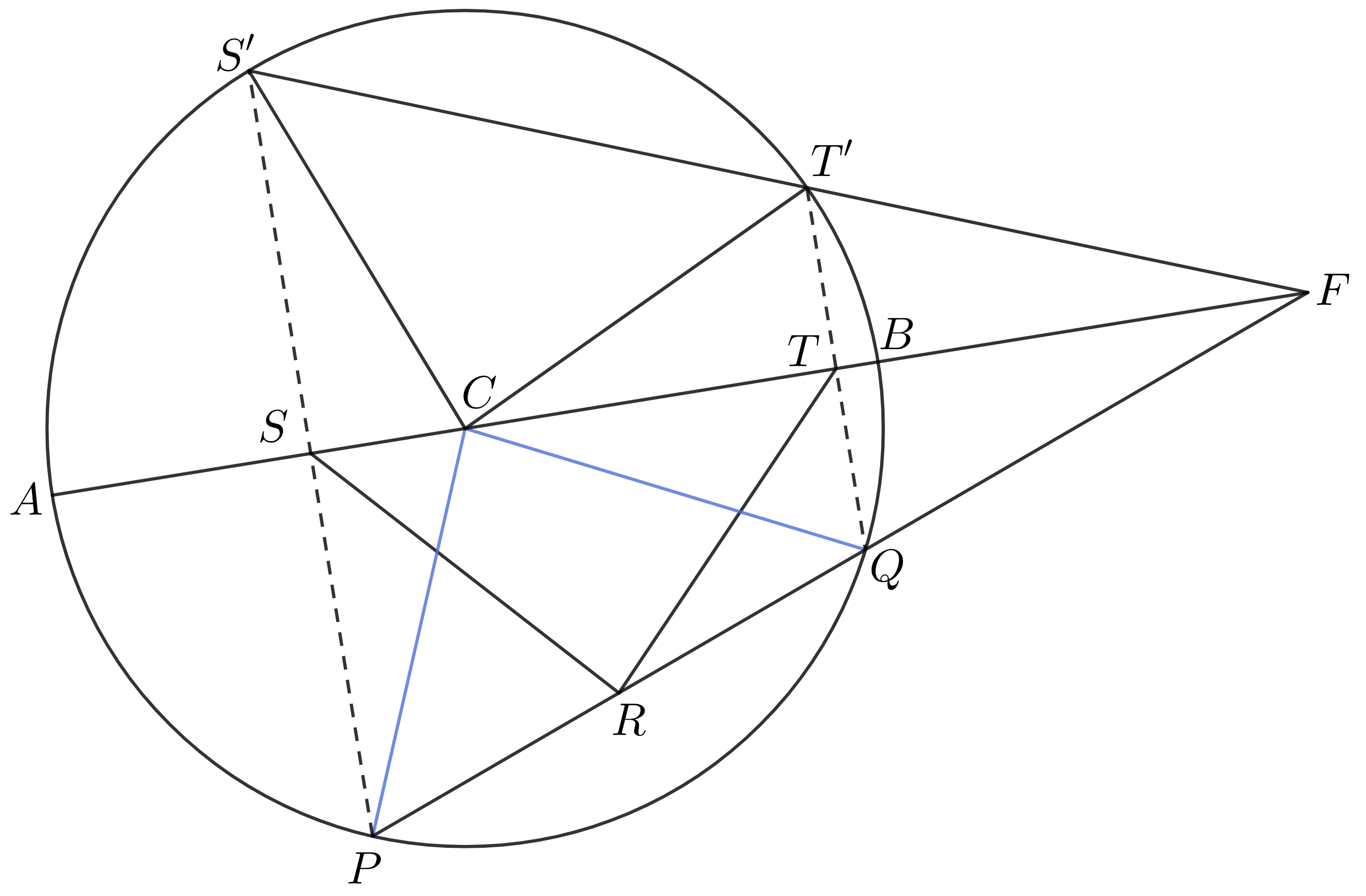 Tu sa nám začína črtať špirálna podobnosť so stredom v $F$ (tak sa tomu vznešene hovorí). Všimnime si, že uhol $\lvert\angle AFS’\rvert = \lvert\angle PFS\rvert$, znovu ide len o osovú symetriu. Potom, keď otočíme uhol $\angle AFS’$, na $\angle PFA$, tak body $S’$ a $T’$ nám pristanú na priamke $AB$ a bod $C$ na priamke $PQ$. Nakoniec ešte nájdime koeficient podobnosti pri ktorom sa $T’$ zobrazí na $T$. To je iba $k=\frac{\lvert TF\rvert}{\lvert T’F\rvert}$. Vieme, že $\triangle SFS’ \sim \triangle TFT’$ podľa vety uu. Totiž, zdieľajú uhol pri bode $F$ a ďalej uhly pri vrcholoch $S$, $T$ sú očividne pravé. Potom máme z pomerov dĺžok $\frac{\lvert SF\rvert}{\lvert S’F\rvert}=\frac{\lvert TF\rvert}{\lvert T’F\rvert} = k$. To ale znamená, že špirálnou podobnosťou s otočením o uhol $\sphericalangle AFS’$ a koeficientom podobnosti $k$ sa nám aj $S’$ zobrazí na $S$.