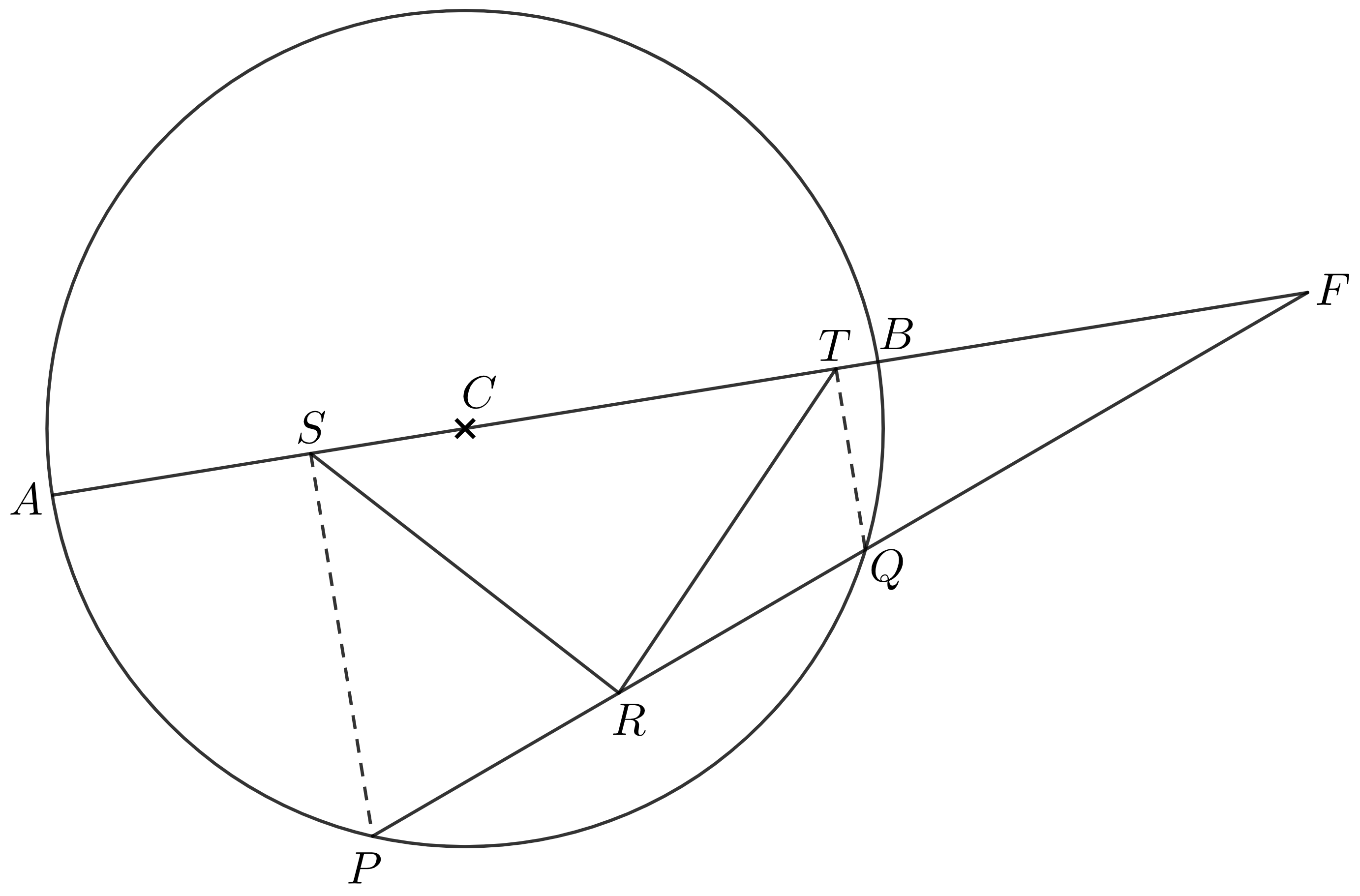 Ďalej si uvedomme, že $\triangle SRT$ je rovnoramenný. Totiž, Keďže $R$ je stredom $PQ$, os strany $ST$ je zároveň aj strednou priečkou lichobežníka $PQTS$ obsahujúcou bod $R$, a teda $R$ leží na osi úsečky $ST$.