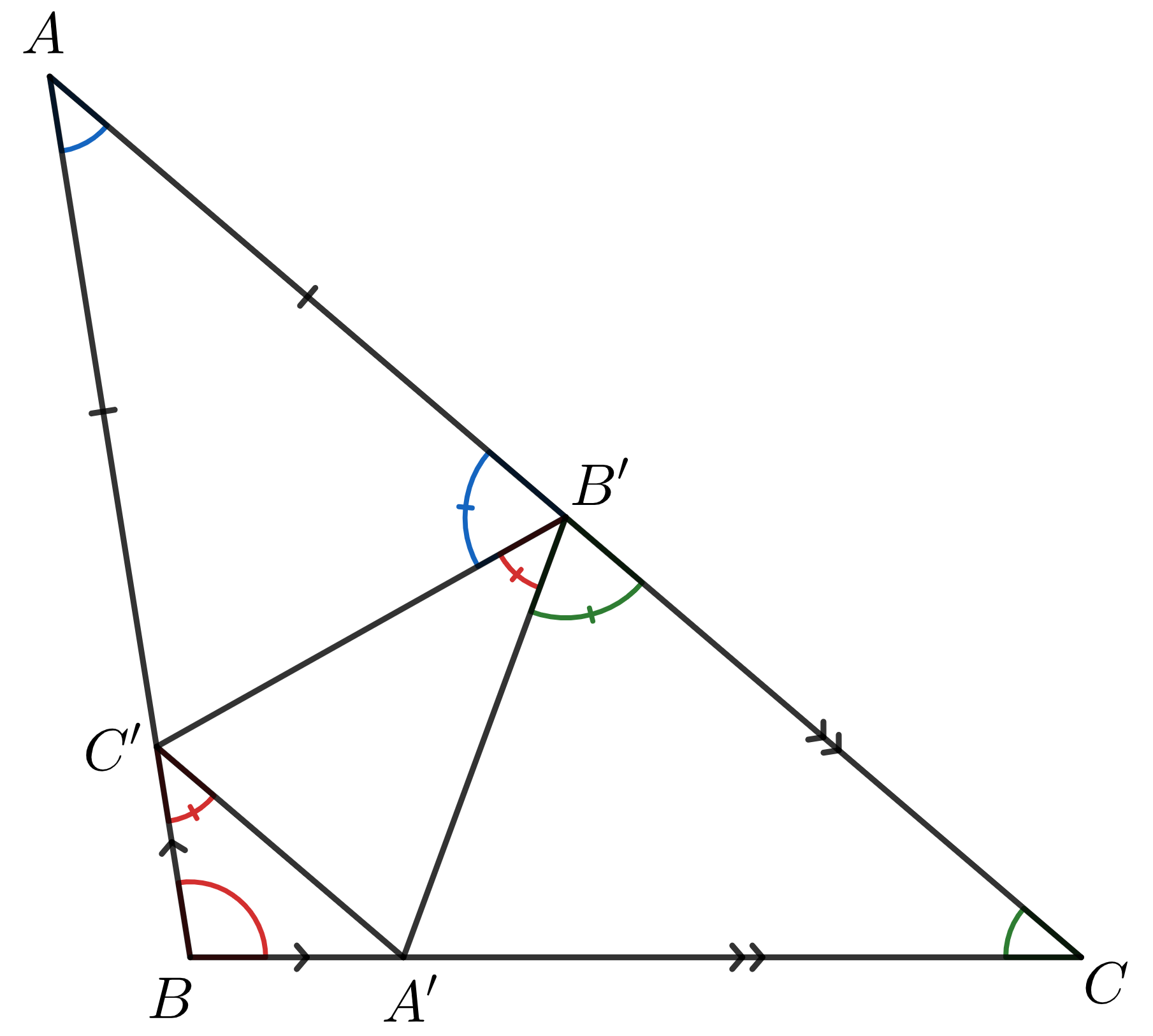 Uvažujme bežné označenie uhlov trojuholníka, čiže pri vrcholoch $A, B, C$ sú postupne uhly $\alpha, \beta, \gamma$. Zo súčtu uhlov v rovnoramennom trojuholníku $AB’C’$ máme, že $|\sphericalangle AB’C’|=90^\circ-\frac\alpha2$. Analogicky vieme dostať aj $|\sphericalangle BC’A’|=90^\circ-\frac\beta2$ a $|\sphericalangle CB’A’|=90^\circ-\frac\gamma2$. Nakoniec vieme vďaka $\alpha+\beta+\gamma=180^\circ$ dopočítať veľkosť uhla $\sphericalangle A’B’C’$ ako $$180^\circ-|\sphericalangle AB’C’|-|\sphericalangle CB’A’|=180^\circ-90^\circ+\frac\alpha2-90^\circ+\frac\gamma2=\frac{\alpha+\gamma}{2}=\frac{180^\circ-\beta}{2}=90^\circ-\frac\beta2.$$ Z vety o obvodovom a úsekovom uhle preto vyplýva, že $AB$ sa dotýka kružnici opísanej $A’B’C’$. Toto vieme analogicky urobiť aj pre zvyšné strany, čím sa presvedčíme, že $A’, B’, C’$ sú dotykové body kružnice vpísanej trojuholníku $ABC$, keďže tá je jednoznačne určená.