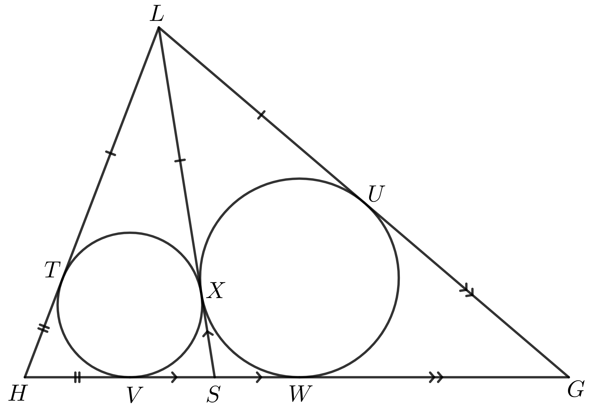 Trojjazyčník je hrozná potvora s troma jazykmi, ktoré sú označené $H, G, L$1 a tvoria trojuholník. Na strane $HG$ sa nachádza bod $S$2, pričom platí, že kružnice vpísané trojuholníkom $HLS$ a $GLS$ sa dotýkajú úsečky $LS$ v rovnakom bode. Dokážte, že bod $S$ je bodom dotyku vpísanej kružnice trojuholníka $HGL$ so stranou $HG$.