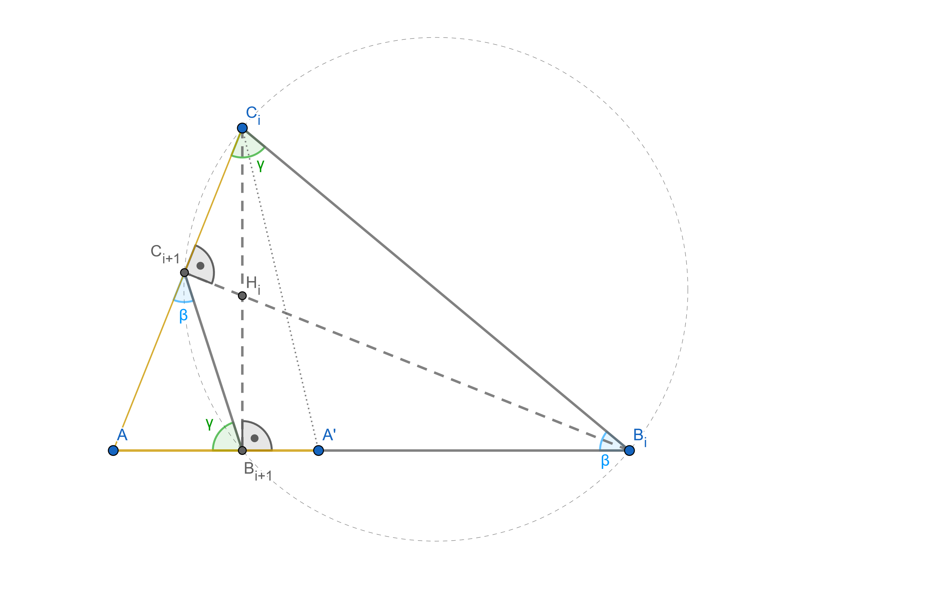 Nakoľko $C_iB_{i+1}$ a $B_iC_{i+1}$ sú výšky, platí $(B_iC_{i+1}, AC_i) = (AC_i, B_iC_{i+1}) = (C_iB_{i+1}, AB_i) = (AB_i, C_iB_{i+1}) = 90^\circ$. Z $(B_iB_{i+1}, B_{i+1}C_i) = (B_iC_{i+1}, C_{i+1}C_i)$ zároveň dostávame, že štvoruholník $C_{i+1}B_{i+1}B_iC_i$ (vo vhodnom poradí záležiac od konštrukcie) je tetivový. Z vety o úsekovom uhle (pre orientované uhly) potom $(C_{i+1}B_{i+1}, B_{i+1}A) = (C_{i+1}C_i, C_iB_i) = (AC_i, C_iB_i) = \gamma_i$. Analogicky $(AC_{i+1}, C_{i+1}B_{i+1}) = \beta_i$.
