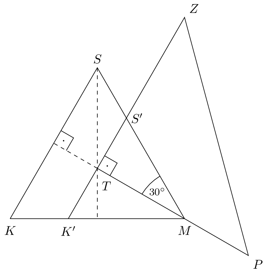 Zo zadania nie je jasne dané, kde presne sa má nachádzať bod $Z$. V riešení sme ho umiestnili na polpriamku $TS’$, no mohli sme ho kľudne dať aj na polpriamku $TK’$. Avšak vďaka tomu, že trojuholník $KMS$ je rovnostranný, máme v ňom symetriu okolo priamky $TM$, a teda bez ohľadu na to, na ktorú stranu priamky $TM$ umiestnime bod $Z$, výsledok bude rovnaký.
