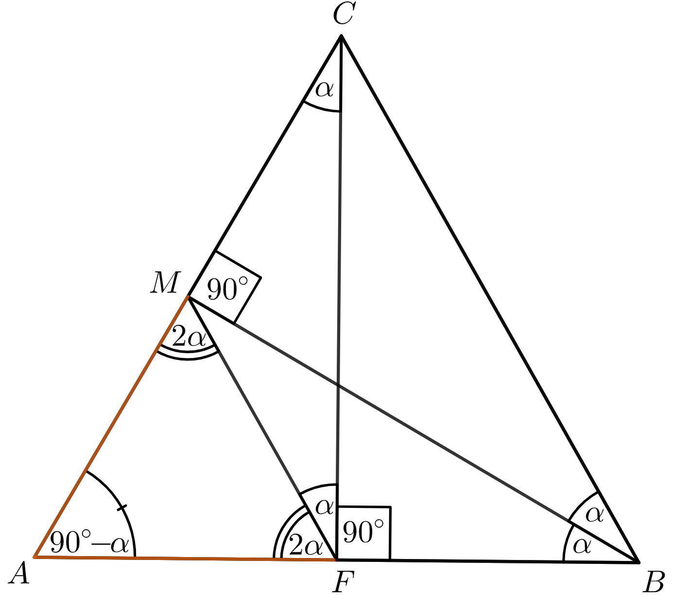 Najprv si všimnime, že $M$ je stredom Tálesovej kružnice nad trojuholníkom $AFC$, preto $\lvert MC \rvert = \lvert MF \rvert$. Vďaka tomu dostávame, že $\lvert\sphericalangle MFC\rvert=\lvert \sphericalangle MCF \rvert=\alpha$, lebo ide o rovnoramenný trojuholník. Taktiež dostávame, že $\lvert\sphericalangle AMF\rvert=2\cdot\lvert \sphericalangle ACF \rvert=2\alpha$. Ide o stredový uhol vzhľadom k vyššie spomínanej Tálesovej kružnici. Teraz nahliadneme, že štvoruholník $MFBC$ je tetivový ($\lvert \sphericalangle MBC \rvert = |\sphericalangle FCA|=\alpha=\lvert \sphericalangle MFC \rvert$). Vďaka tomu $\lvert \sphericalangle MCF \rvert = \lvert \sphericalangle MBF \rvert= \alpha$.