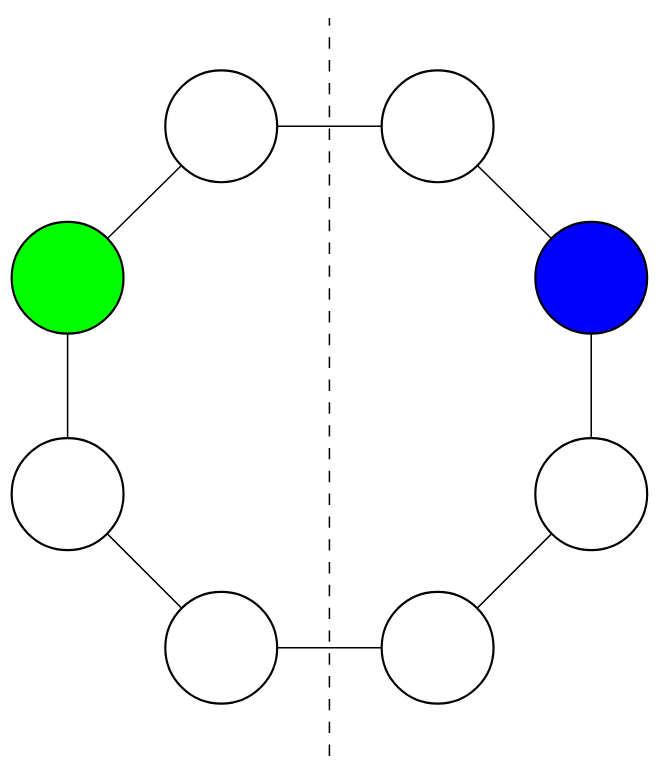 Nech sme teda v situácií, ktorá je symetrická podľa tejto osi symetrie, len s vymenenými farbami. Potom Matúš zahrá nejaký ťah. Keďže tento ťah bol legálny, tak legálny ťah bude aj zahranie opačnej farby na opačnú stranu. Tým získame opäť symetrickú situáciu. Toto sa stane aj v prípade, že je to vrchné alebo spodné políčko nášho plánika, lebo síce políčku, ktoré chceme ofarbovať, pribudol ofarbený sused, ale keďže chceme ofarbovať opačnou farbou, môžeme to spraviť.