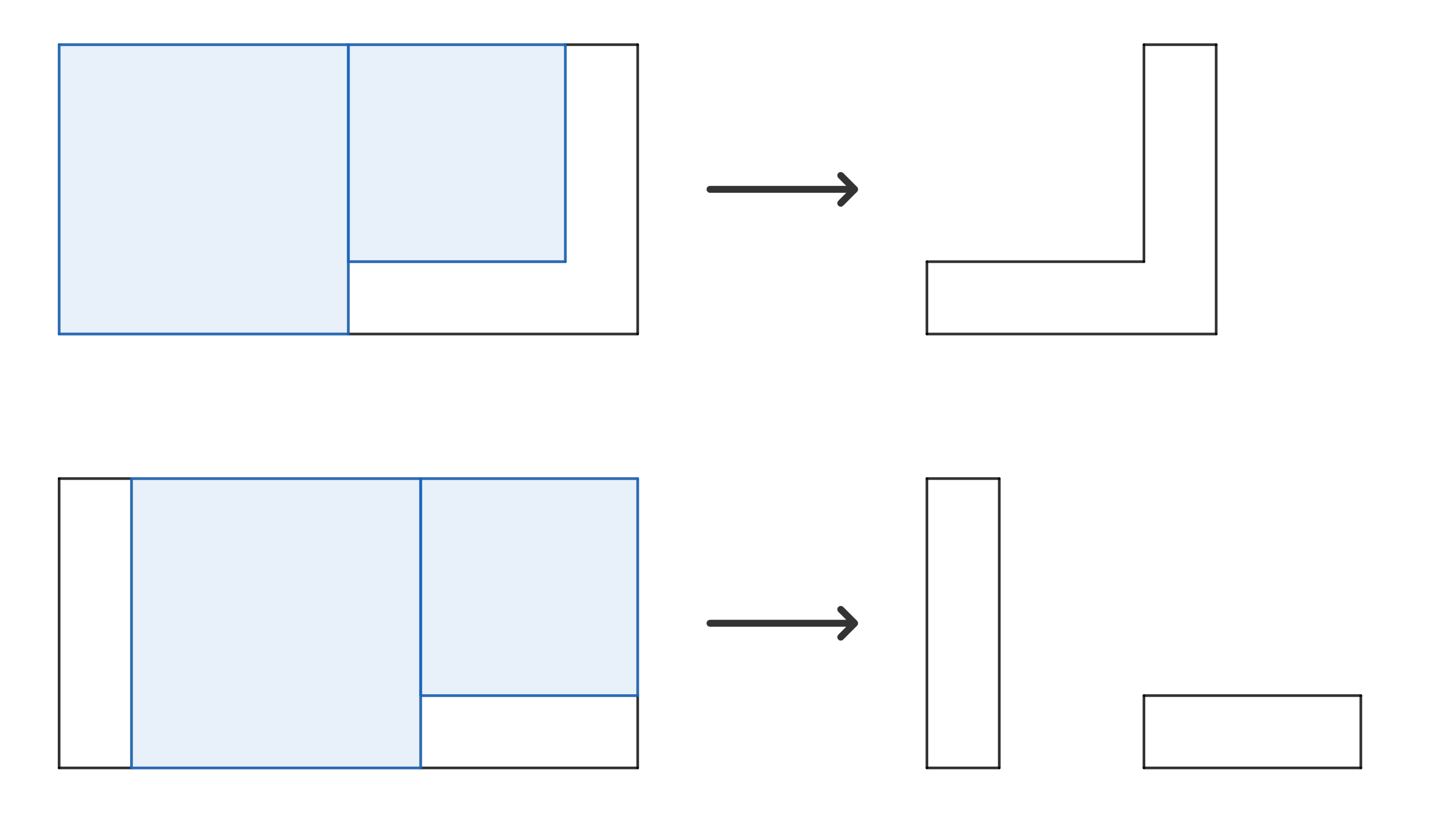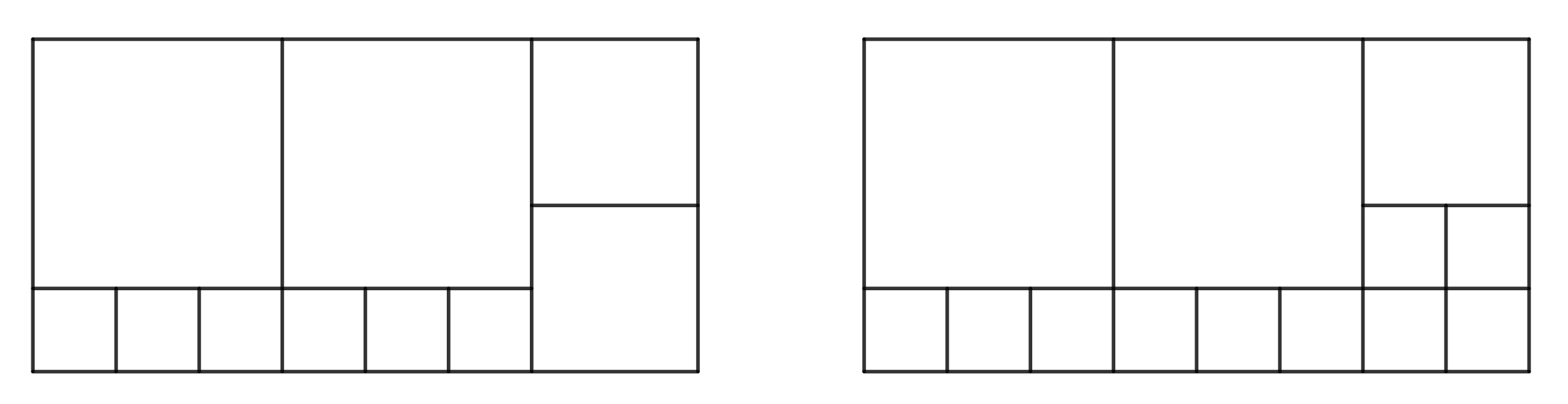 Keďže teda musí platiť $b \le \frac{d}{3}$ , vieme, že možnosti označené * v tabuľke nie sú možné a preto ich nebudeme brať do úvahy. Špeciálne sa pozrieme aj na prípad $a = 1$, $b = 1$, $c = 1$, a $d = 3$. Keď od čokolády najprv oddelíme $4\times 4$ štvorec a potom $3\times 3$ štvorec, získame jeden z dvoch nižšie uvedených zvyškov, kde vidíme, že neexistuje miesto pre $2\times 2$, preto túto možnosť tiež nebudeme brať do úvahy.